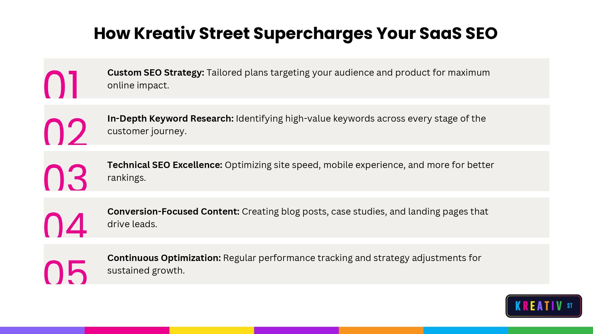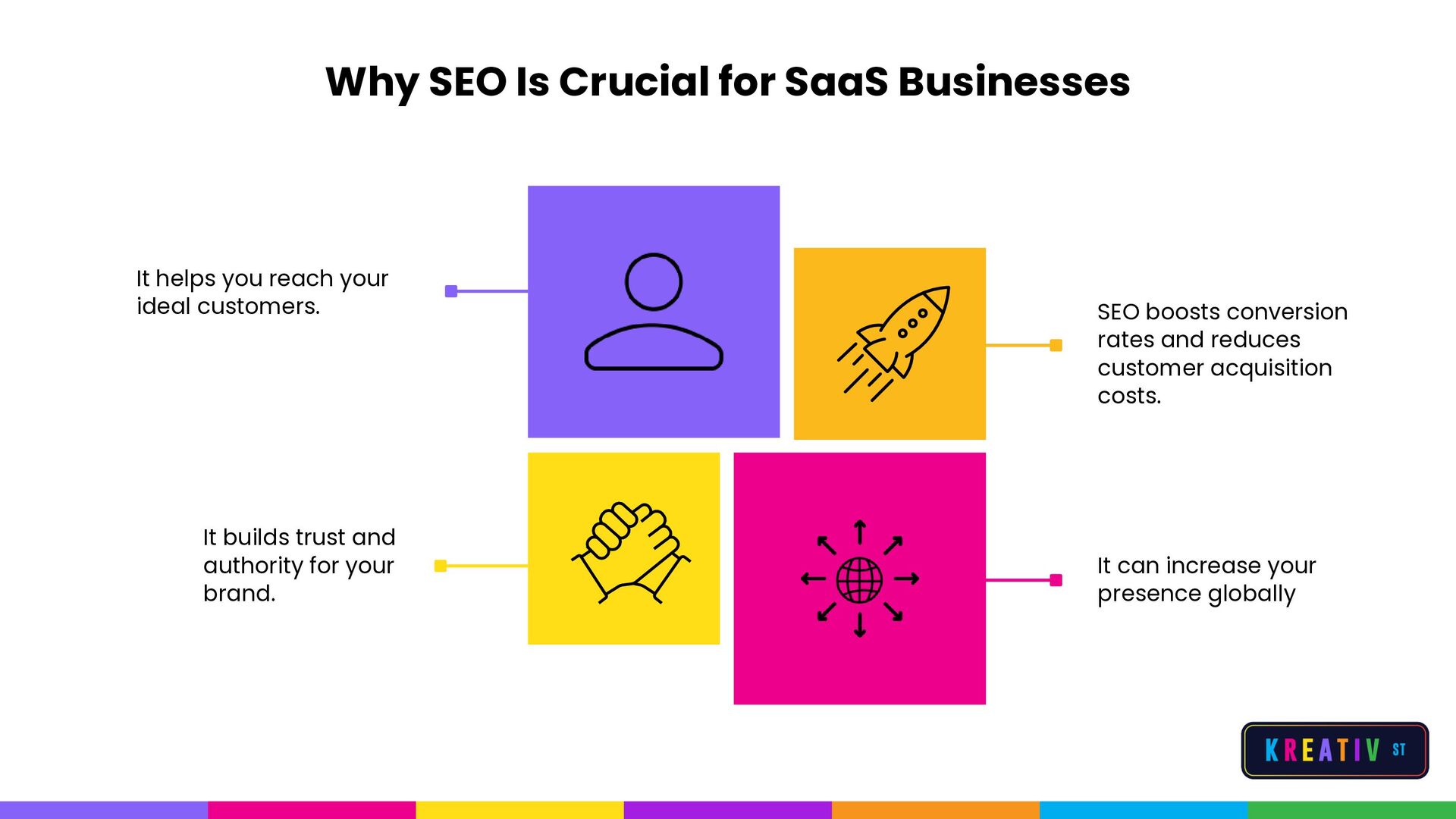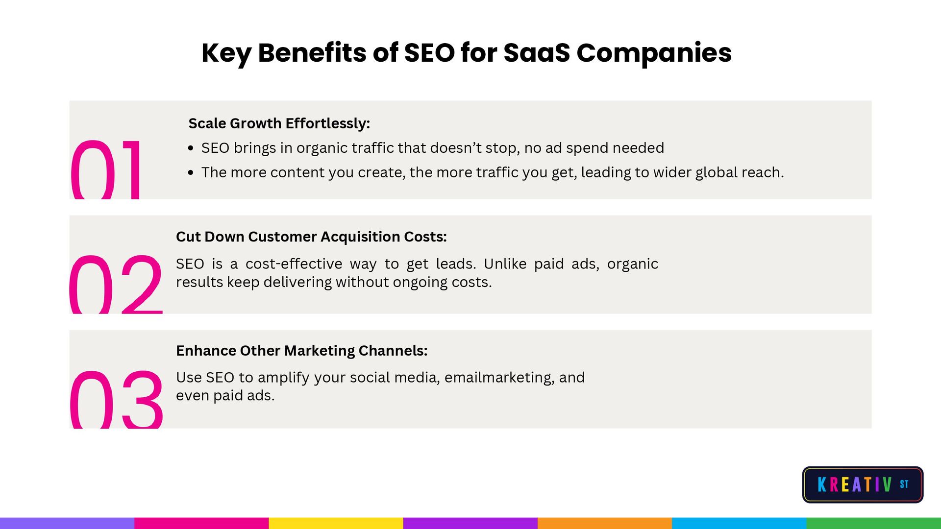 to get leads. Unlike paid ads, organic results keep delivering without ongoing costs. Scale Growth Effortlessly: SEO brings in organic traffic that doesn’t stop, no ad spend needed The more content you create, the more traffic you get, leading to wider global reach. Enhance Other Marketing Channels: Use SEO to amplify your social media, emailmarketing, and even paid ads. Key Benefits of SEO for SaaS Companies