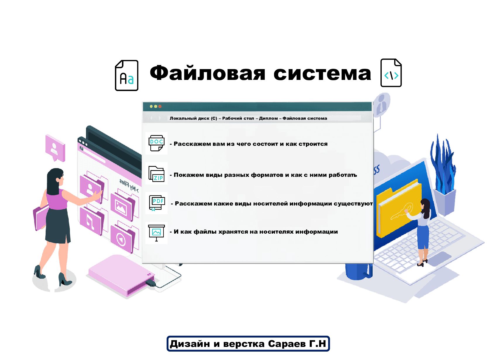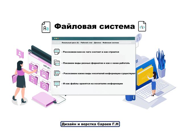 строится - Покажем виды разных форматов и как с ними работать - Расскажем какие виды носителей информации существуют - И как файлы хранятся на носителях информации Локальный диск (С) – Рабочий стол – Диплом – Файловая система Дизайн и верстка Сараев Г.Н