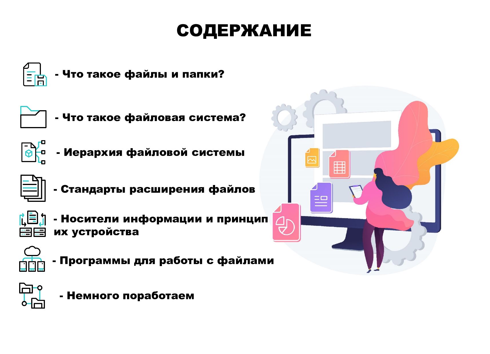 файловая система? - Стандарты расширения файлов - Носители информации и принцип их устройства - Немного поработаем - Иерархия файловой системы - Программы для работы с файлами