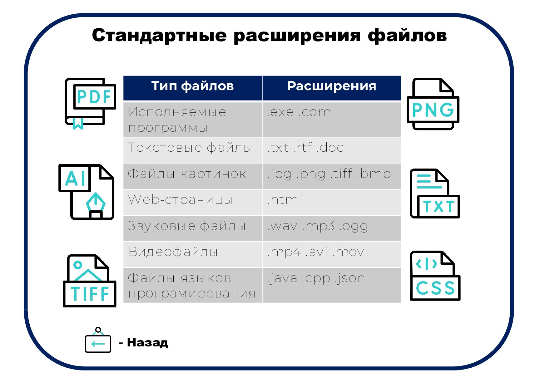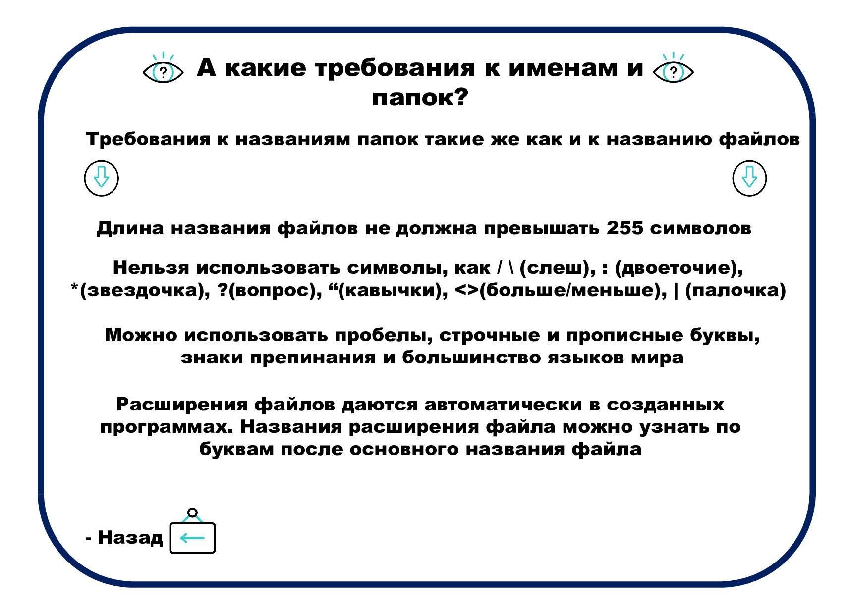 папок такие же как и к названию файлов Длина названия файлов не должна превышать 255 символов Нельзя использовать символы, как / \ (слеш), : (двоеточие), *(звездочка), ?(вопрос), “(кавычки), <>(больше/меньше), | (палочка) Можно использовать пробелы, строчные и прописные буквы, знаки препинания и большинство языков мира Расширения файлов даются автоматически в созданных программах. Названия расширения файла можно узнать по буквам после основного названия файла - Назад