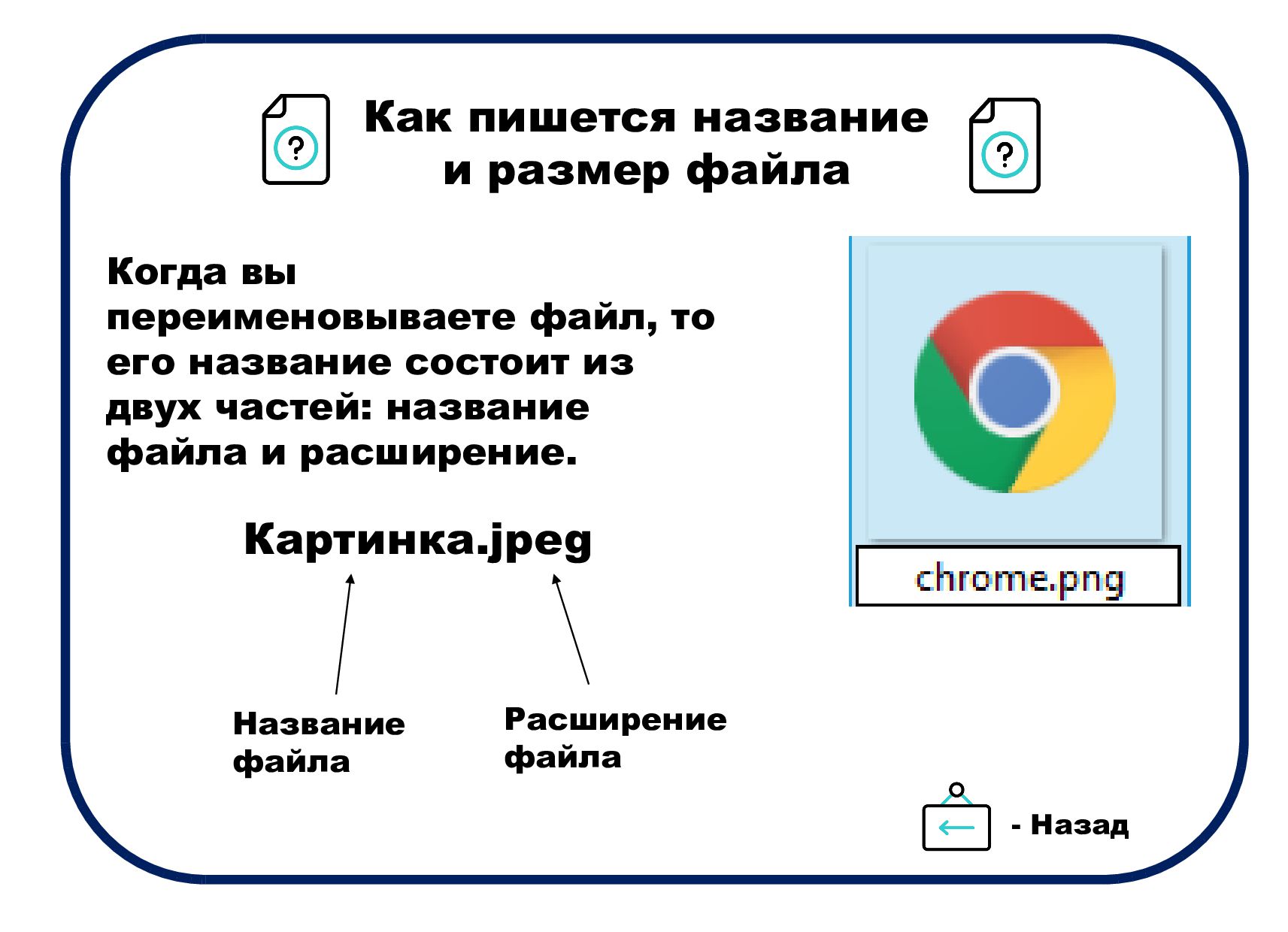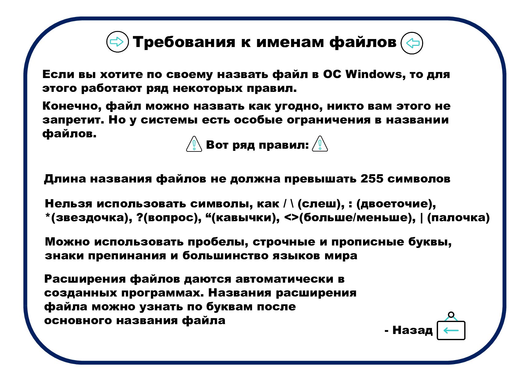 файл в ОС Windows, то для этого работают ряд некоторых правил. Конечно, файл можно назвать как угодно, никто вам этого не запретит. Но у системы есть особые ограничения в названии файлов. Вот ряд правил: Длина названия файлов не должна превышать 255 символов Нельзя использовать символы, как / \ (слеш), : (двоеточие), *(звездочка), ?(вопрос), “(кавычки), <>(больше/меньше), | (палочка) Можно использовать пробелы, строчные и прописные буквы, знаки препинания и большинство языков мира Расширения файлов даются автоматически в созданных программах. Названия расширения файла можно узнать по буквам после основного названия файла - Назад