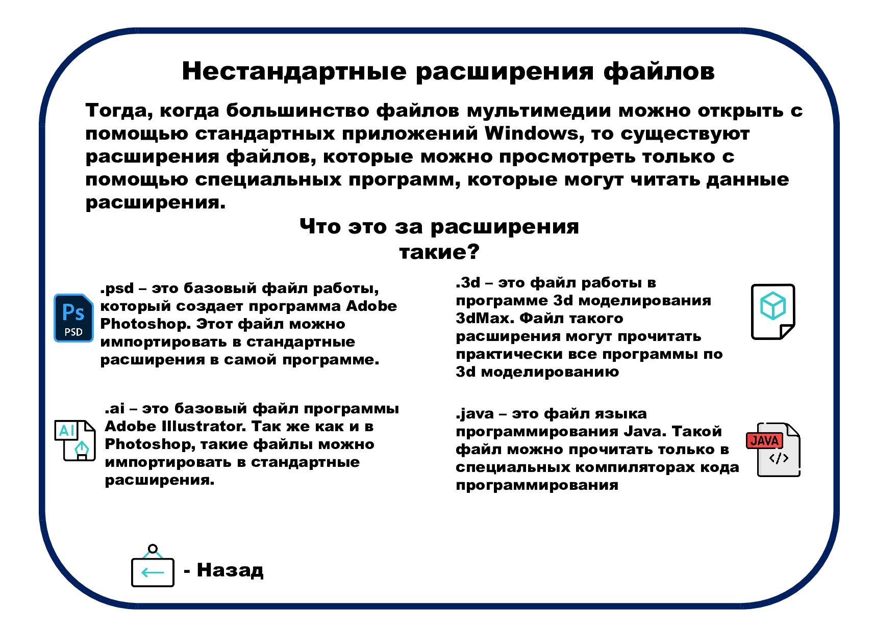 с помощью стандартных приложений Windows, то существуют расширения файлов, которые можно просмотреть только с помощью специальных программ, которые могут читать данные расширения. Что это за расширения такие? .psd – это базовый файл работы, который создает программа Adobe Photoshop. Этот файл можно импортировать в стандартные расширения в самой программе. .ai – это базовый файл программы Adobe Illustrator. Так же как и в Photoshop, такие файлы можно импортировать в стандартные расширения. .java – это файл языка программирования Java. Такой файл можно прочитать только в специальных компиляторах кода программирования .3d – это файл работы в программе 3d моделирования 3dMax. Файл такого расширения могут прочитать практически все программы по 3d моделированию - Назад