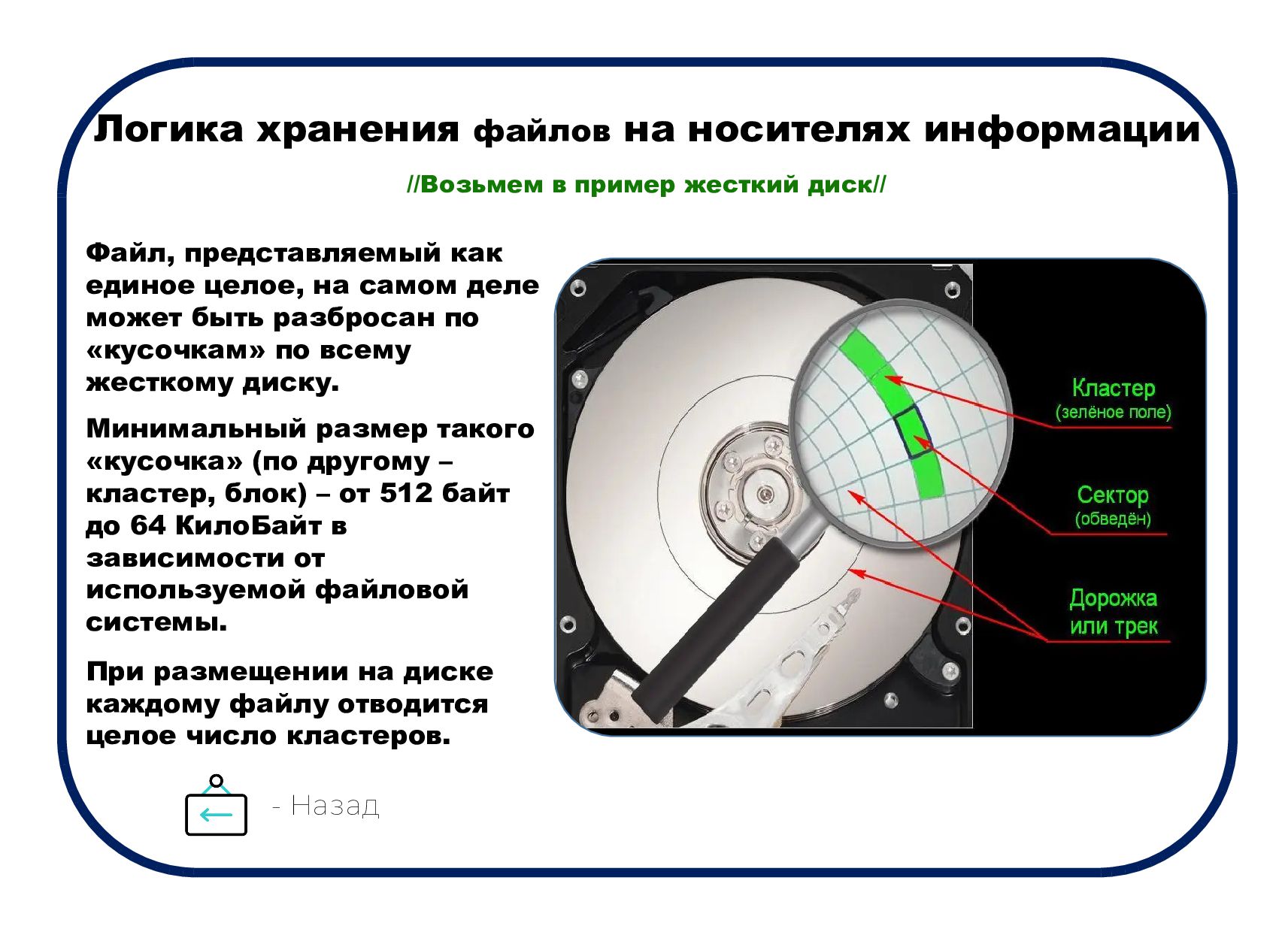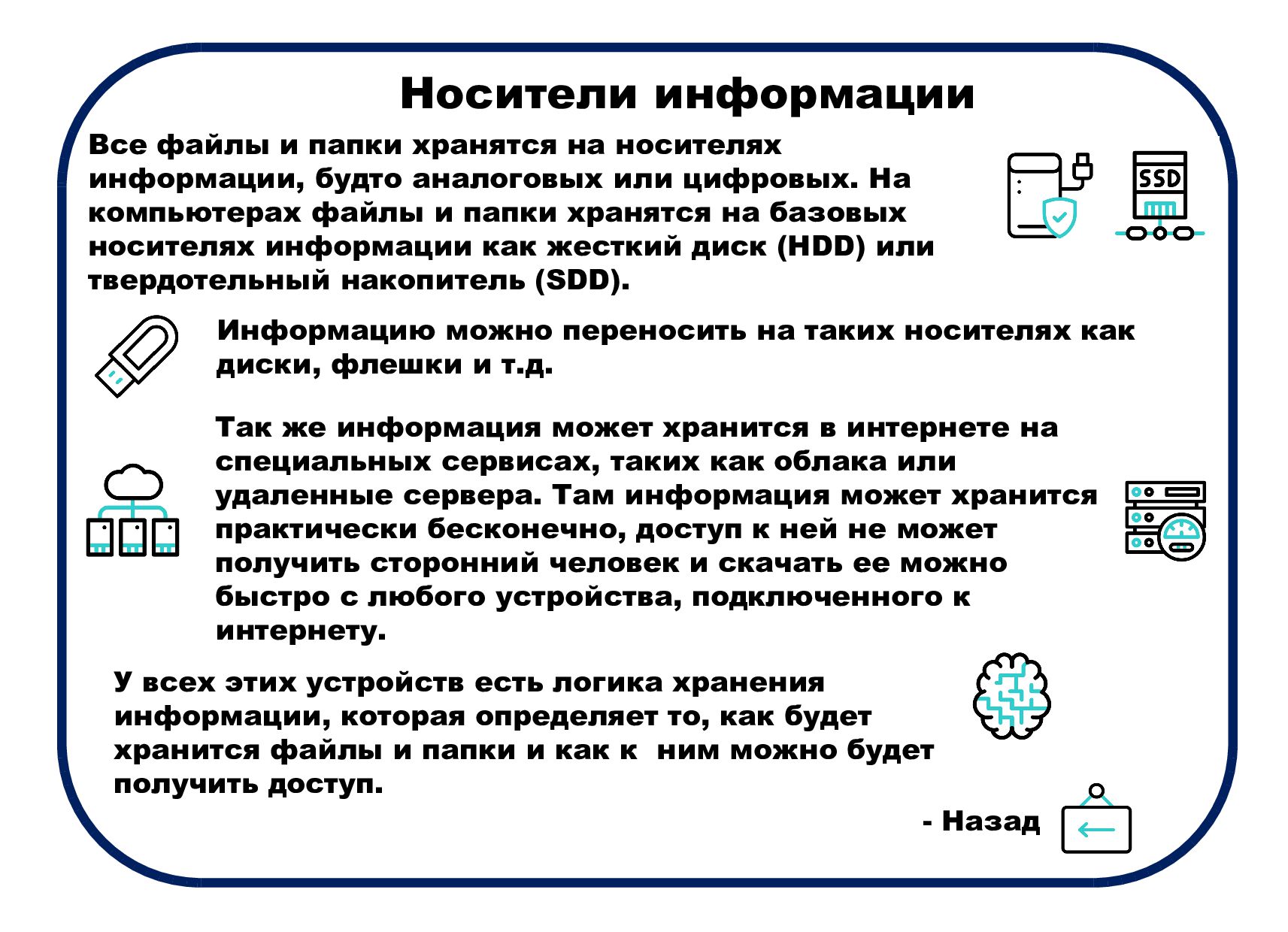 будто аналоговых или цифровых. На компьютерах файлы и папки хранятся на базовых носителях информации как жесткий диск (HDD) или твердотельный накопитель (SDD). Так же информация может хранится в интернете на специальных сервисах, таких как облака или удаленные сервера. Там информация может хранится практически бесконечно, доступ к ней не может получить сторонний человек и скачать ее можно быстро с любого устройства, подключенного к интернету. Информацию можно переносить на таких носителях как диски, флешки и т.д. У всех этих устройств есть логика хранения информации, которая определяет то, как будет хранится файлы и папки и как к ним можно будет получить доступ. - Назад