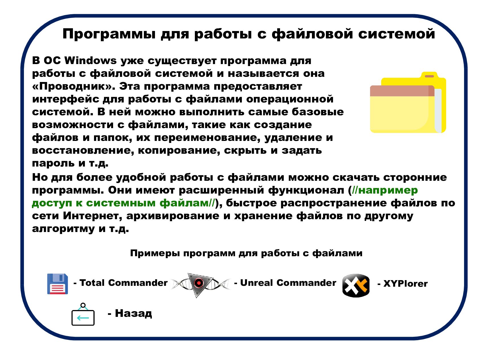 существует программа для работы с файловой системой и называется она «Проводник». Эта программа предоставляет интерфейс для работы с файлами операционной системой. В ней можно выполнить самые базовые возможности с файлами, такие как создание файлов и папок, их переименование, удаление и восстановление, копирование, скрыть и задать пароль и т.д. Но для более удобной работы с файлами можно скачать сторонние программы. Они имеют расширенный функционал (//например доступ к системным файлам//), быстрое распространение файлов по сети Интернет, архивирование и хранение файлов по другому алгоритму и т.д. Примеры программ для работы с файлами - Total Commander - Unreal Commander - XYPlorer - Назад