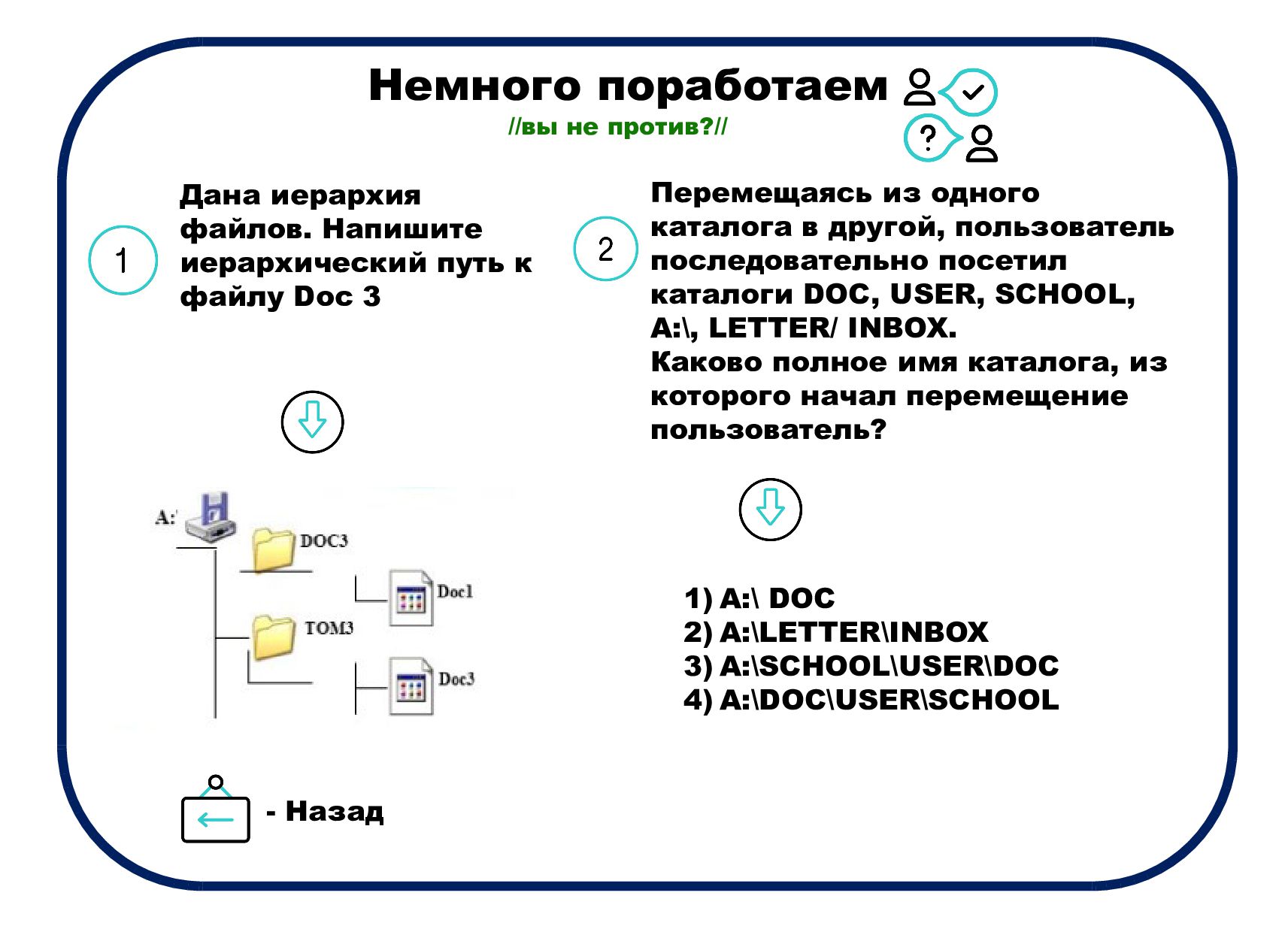 путь к файлу Doc 3 Перемещаясь из одного каталога в другой, пользователь последовательно посетил каталоги DOC, USER, SCHOOL, A:\, LETTER/ INBOX. Каково полное имя каталога, из которого начал перемещение пользователь? 1) A:\ DOC 2) A:\LETTER\INBOX 3) A:\SCHOOL\USER\DOC 4) A:\DOC\USER\SCHOOL - Назад