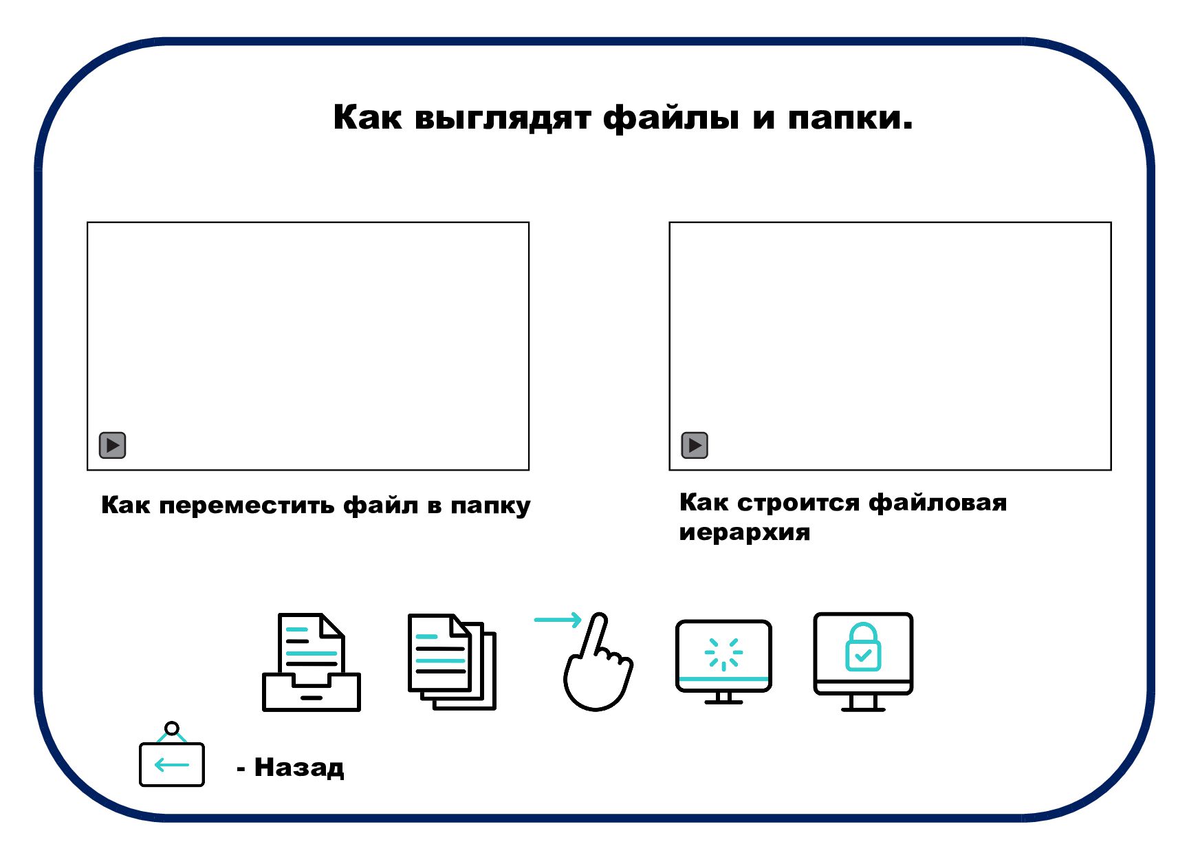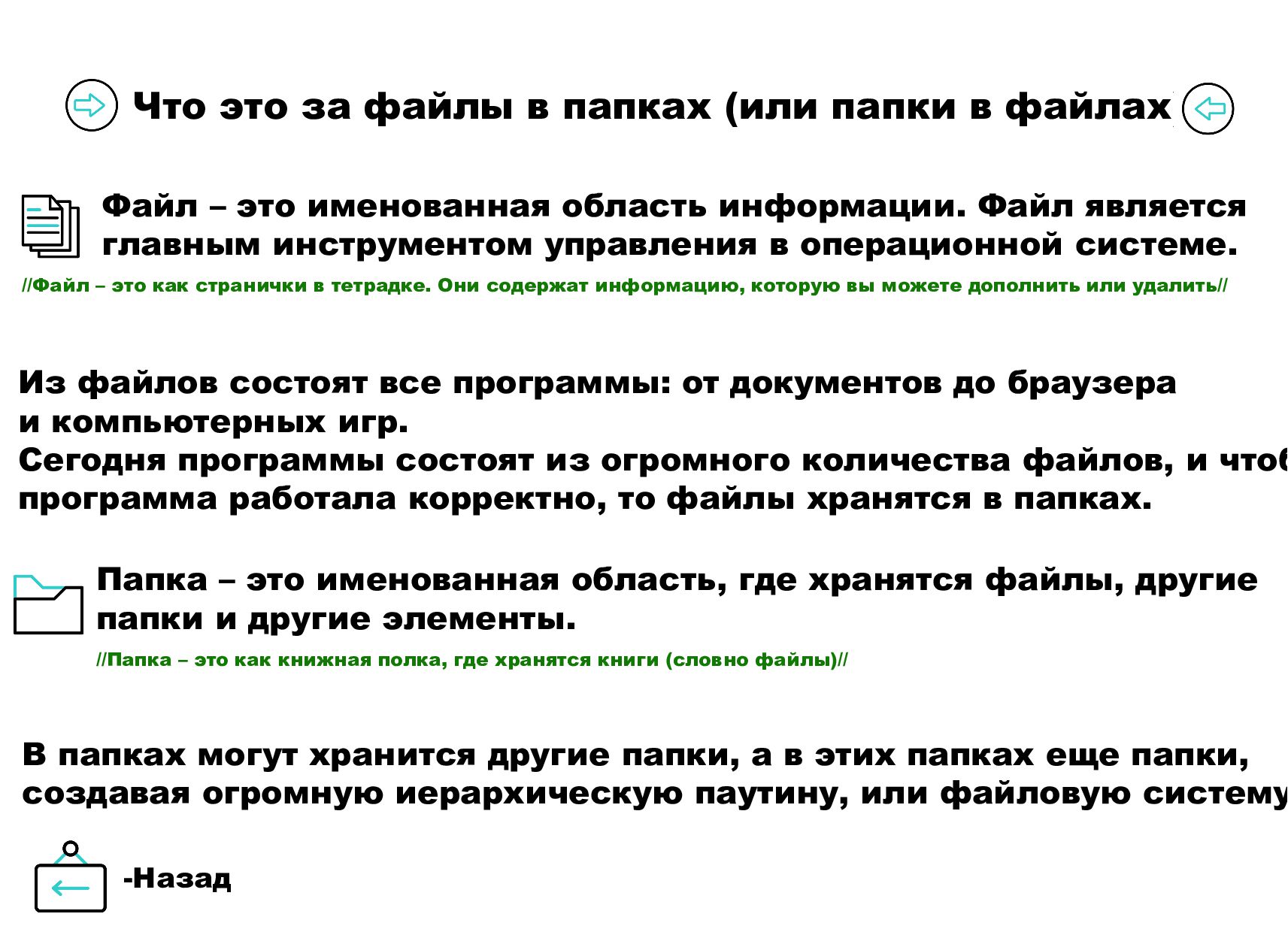 Файл – это именованная область информации. Файл является главным инструментом управления в операционной системе. //Файл – это как странички в тетрадке. Они содержат информацию, которую вы можете дополнить или удалить// Из файлов состоят все программы: от документов до браузера и компьютерных игр. Сегодня программы состоят из огромного количества файлов, и чтоб программа работала корректно, то файлы хранятся в папках. Папка – это именованная область, где хранятся файлы, другие папки и другие элементы. //Папка – это как книжная полка, где хранятся книги (словно файлы)// В папках могут хранится другие папки, а в этих папках еще папки, создавая огромную иерархическую паутину, или файловую систему -Назад