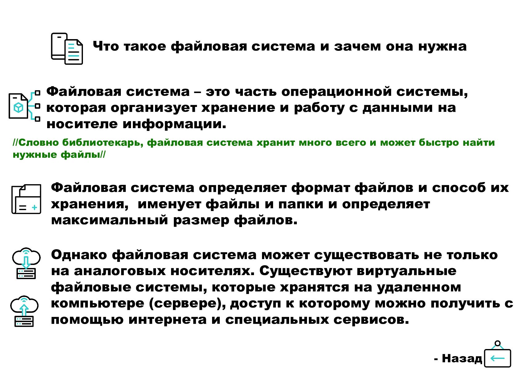 – это часть операционной системы, которая организует хранение и работу с данными на носителе информации. //Словно библиотекарь, файловая система хранит много всего и может быстро найти нужные файлы// Файловая система определяет формат файлов и способ их хранения, именует файлы и папки и определяет максимальный размер файлов. Однако файловая система может существовать не только на аналоговых носителях. Существуют виртуальные файловые системы, которые хранятся на удаленном компьютере (сервере), доступ к которому можно получить с помощью интернета и специальных сервисов. - Назад