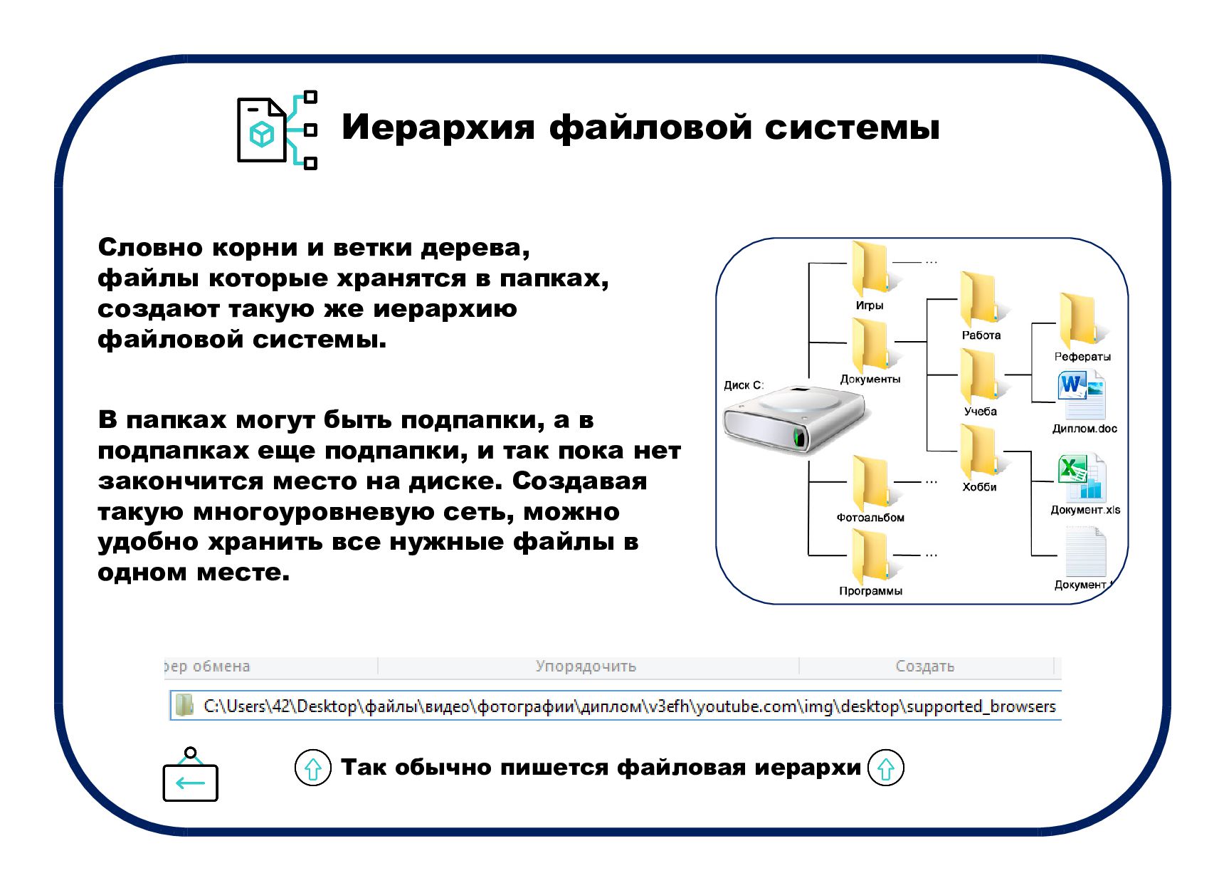 хранятся в папках, создают такую же иерархию файловой системы. В папках могут быть подпапки, а в подпапках еще подпапки, и так пока нет закончится место на диске. Создавая такую многоуровневую сеть, можно удобно хранить все нужные файлы в одном месте. Так обычно пишется файловая иерархия
