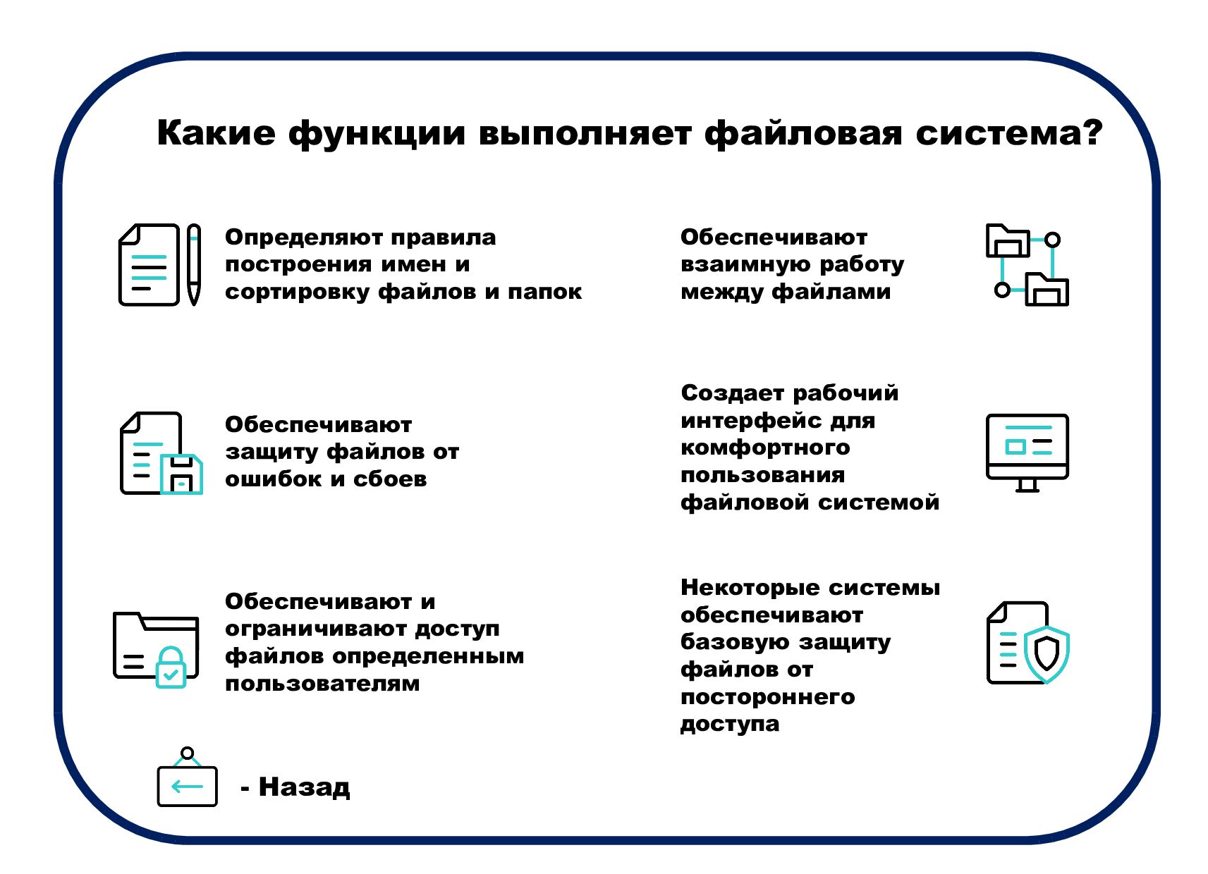 сортировку файлов и папок Обеспечивают защиту файлов от ошибок и сбоев Обеспечивают и ограничивают доступ файлов определенным пользователям Обеспечивают взаимную работу между файлами Создает рабочий интерфейс для комфортного пользования файловой системой Некоторые системы обеспечивают базовую защиту файлов от постороннего доступа - Назад