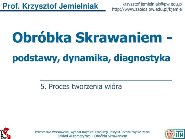 i Obróbki Skrawaniem Prof. Krzysztof Jemielniak [email protected] http://www.zaoios.pw.edu.pl/kjemiel Obróbka Skrawaniem - podstawy, dynamika, diagnostyka 5. Proces tworzenia wióra