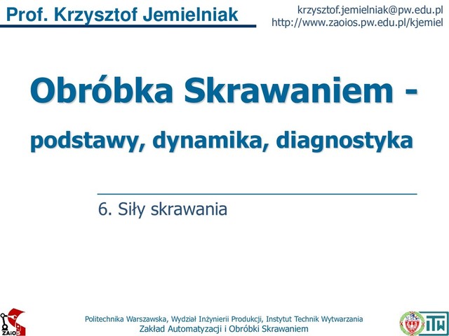 i Obróbki Skrawaniem Prof. Krzysztof Jemielniak [email protected] http://www.zaoios.pw.edu.pl/kjemiel Obróbka Skrawaniem - podstawy, dynamika, diagnostyka 6. Siły skrawania
