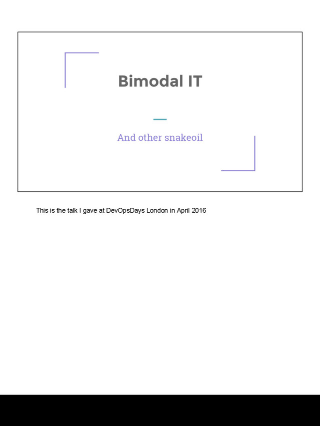 I presented my critique of Bimodal IT at DevOps days, it was a fun talk to give with some great questions from the audience; all in all a very well run event. Here's the slides.