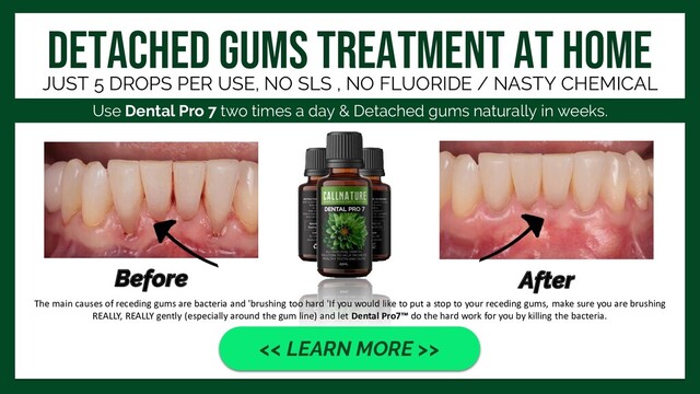 / NASTY CHEMICAL Use Dental Pro 7 two times a day & Detached gums naturally in weeks. << LEARN MORE >> The main causes of receding gums are bacteria and 'brushing too hard 'If you would like to put a stop to your receding gums, make sure you are brushing REALLY, REALLY gently (especially around the gum line) and let Dental Pro7™ do the hard work for you by killing the bacteria. Detached Gums Treatment At Home Before After