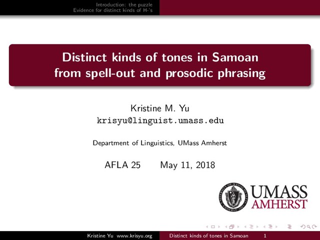 puzzle(s): previous work Prevoius work: unification hypotheses with common assumption: H- inserted in phonological grammar as reflex of some prosodic category type. Kristine Yu www.krisyu.org Distinct kinds of tones in Samoan 17