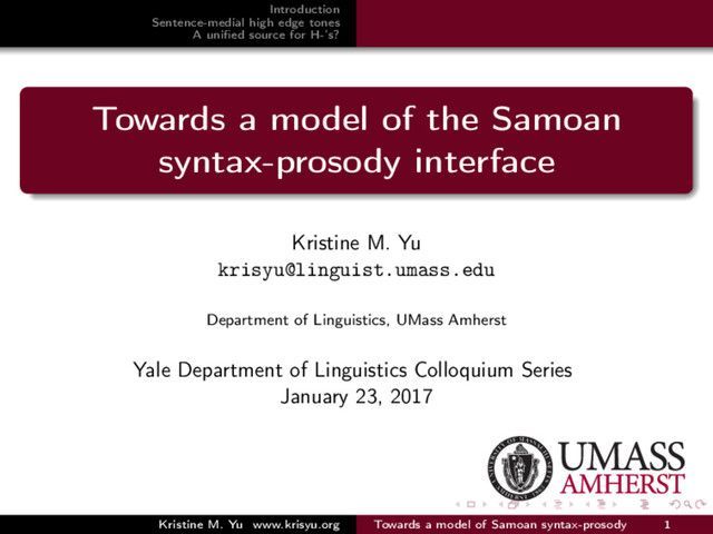 A general syntactic relation? A general phonological relation? Conclusion In Samoan, placement of sentence-medial high edge tones entirely predictable with knowledge of syntactic structure But not clear that a cross-categorial syntactic relation unifies configurations where H- appears Kristine M. Yu www.krisyu.org Towards a model of Samoan syntax-prosody 48