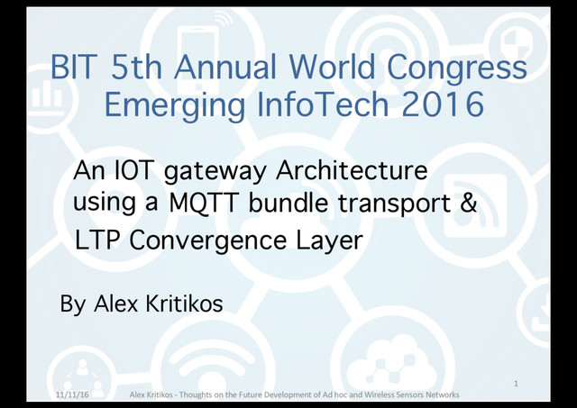 hoc and Wireless Sensors Networks BIT 5th Annual World Congress Emerging InfoTech 2016 An IOT gateway Architecture using a MQTT bundle transport & LTP Convergence Layer 11/11/16 1 By Alex Kritikos