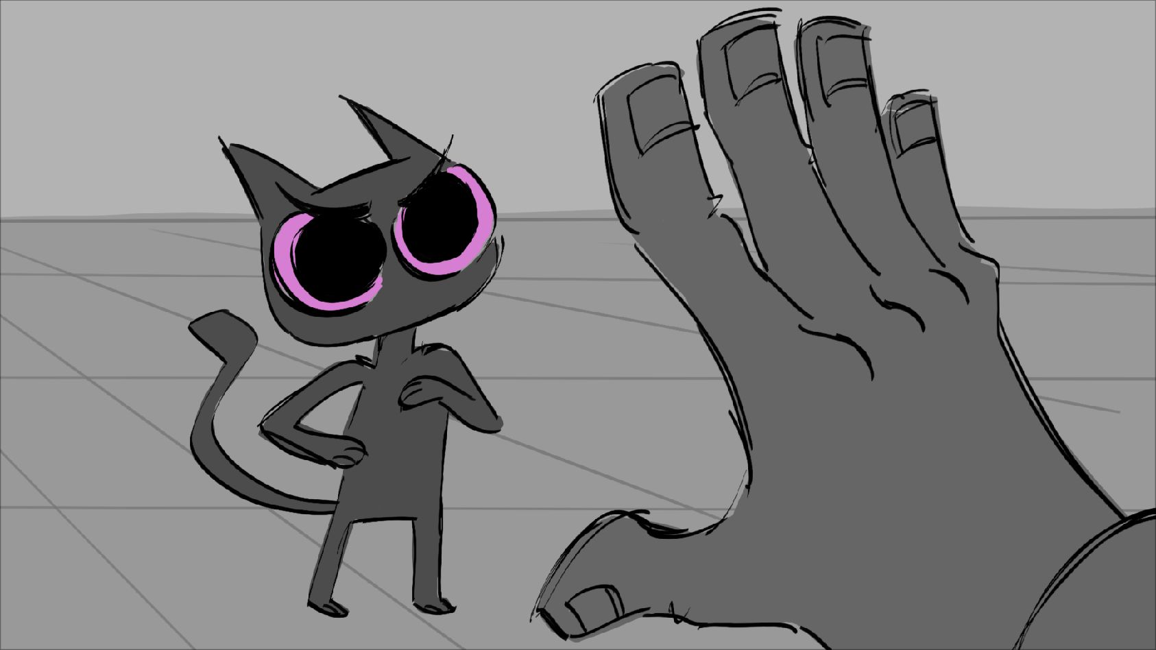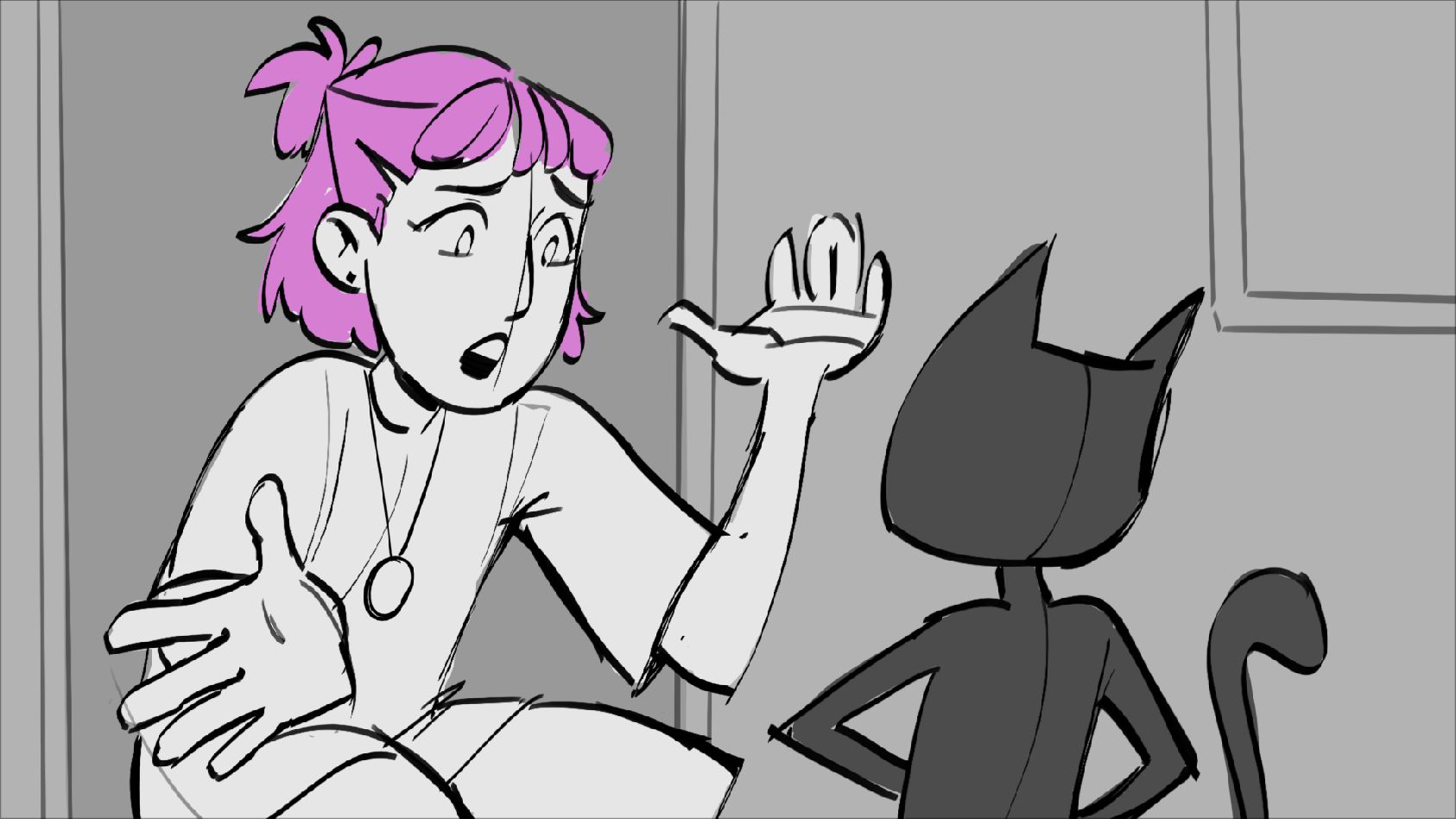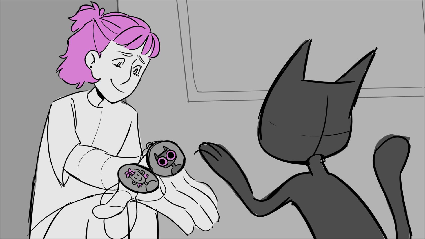 A cat tries to stop his owner from leaving. She promises she'll be back and leaves him with a gift until then.