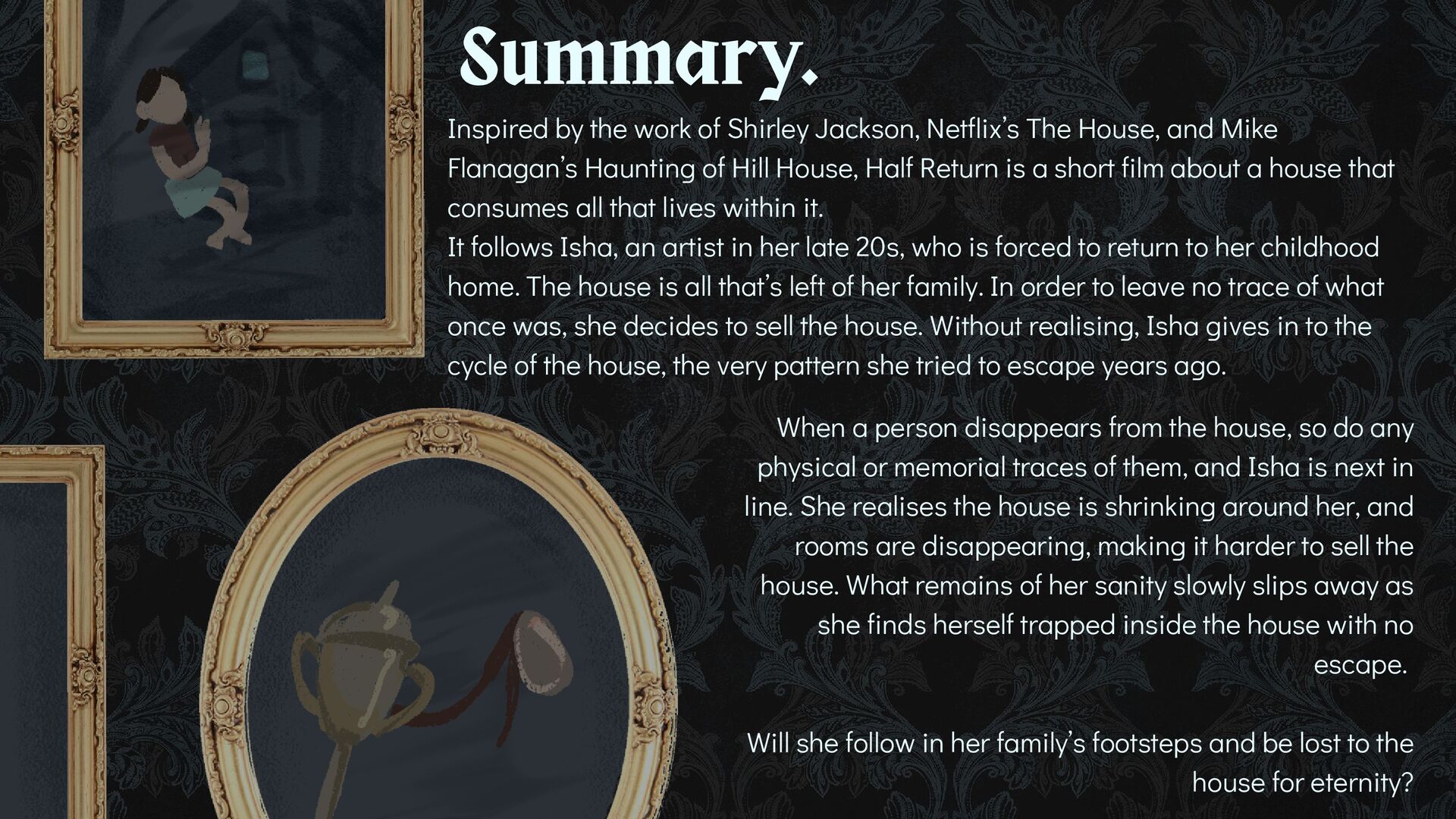 House, and Mike Flanagan’s Haunting of Hill House, Half Return is a short film about a house that consumes all that lives within it. It follows Isha, an artist in her late 20s, who is forced to return to her childhood home. The house is all that’s left of her family. In order to leave no trace of what once was, she decides to sell the house. Without realising, Isha gives in to the cycle of the house, the very pattern she tried to escape years ago. When a person disappears from the house, so do any physical or memorial traces of them, and Isha is next in line. She realises the house is shrinking around her, and rooms are disappearing, making it harder to sell the house. What remains of her sanity slowly slips away as she finds herself trapped inside the house with no escape. Will she follow in her family’s footsteps and be lost to the house for eternity?