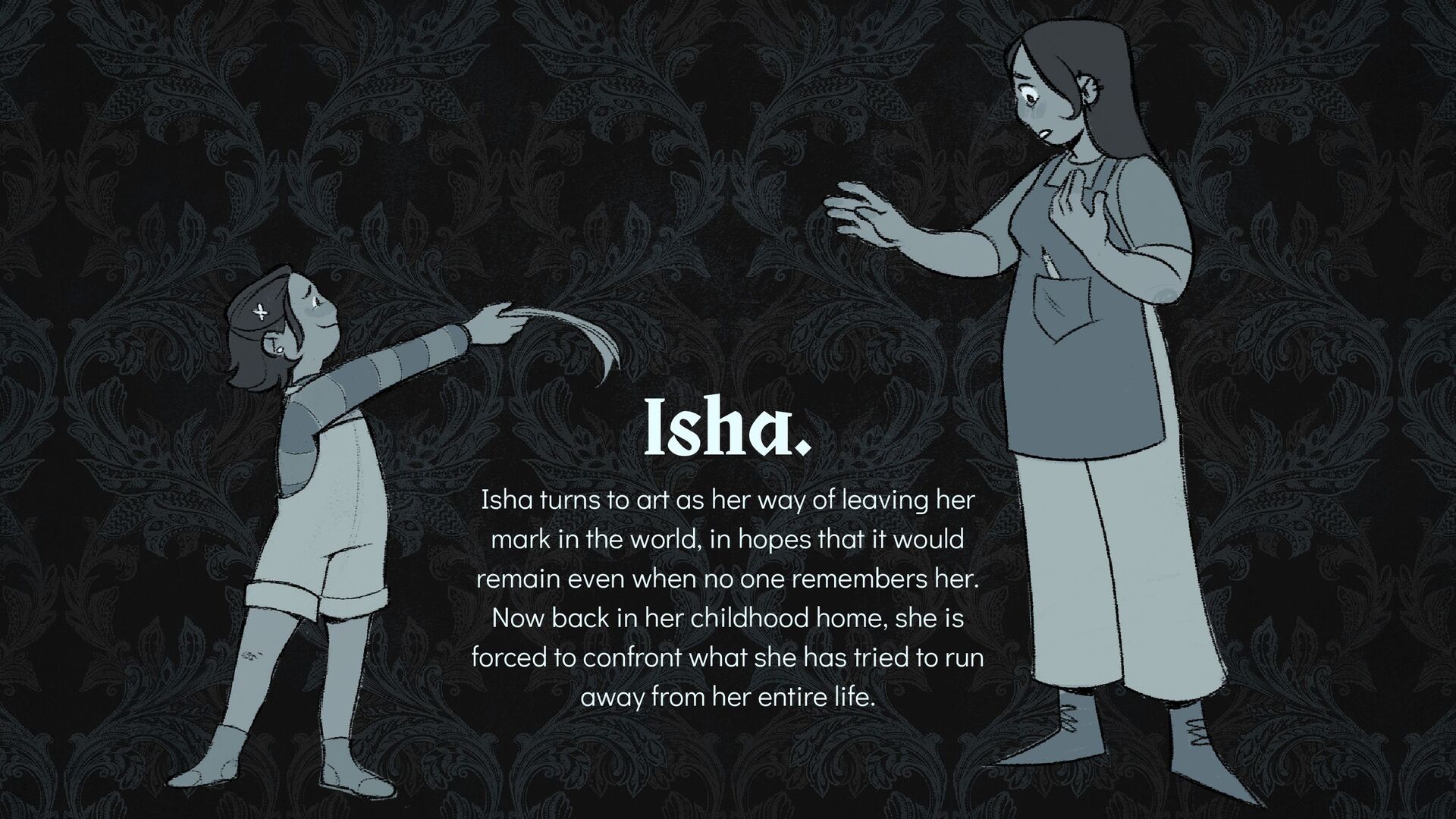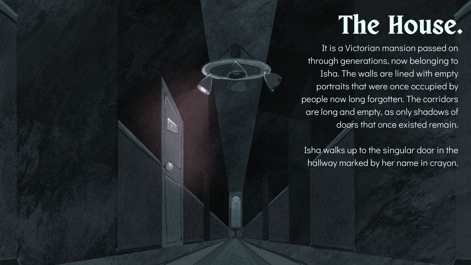 generations, now belonging to Isha. The walls are lined with empty portraits that were once occupied by people now long forgotten. The corridors are long and empty, as only shadows of doors that once existed remain. Isha walks up to the singular door in the hallway marked by her name in crayon.