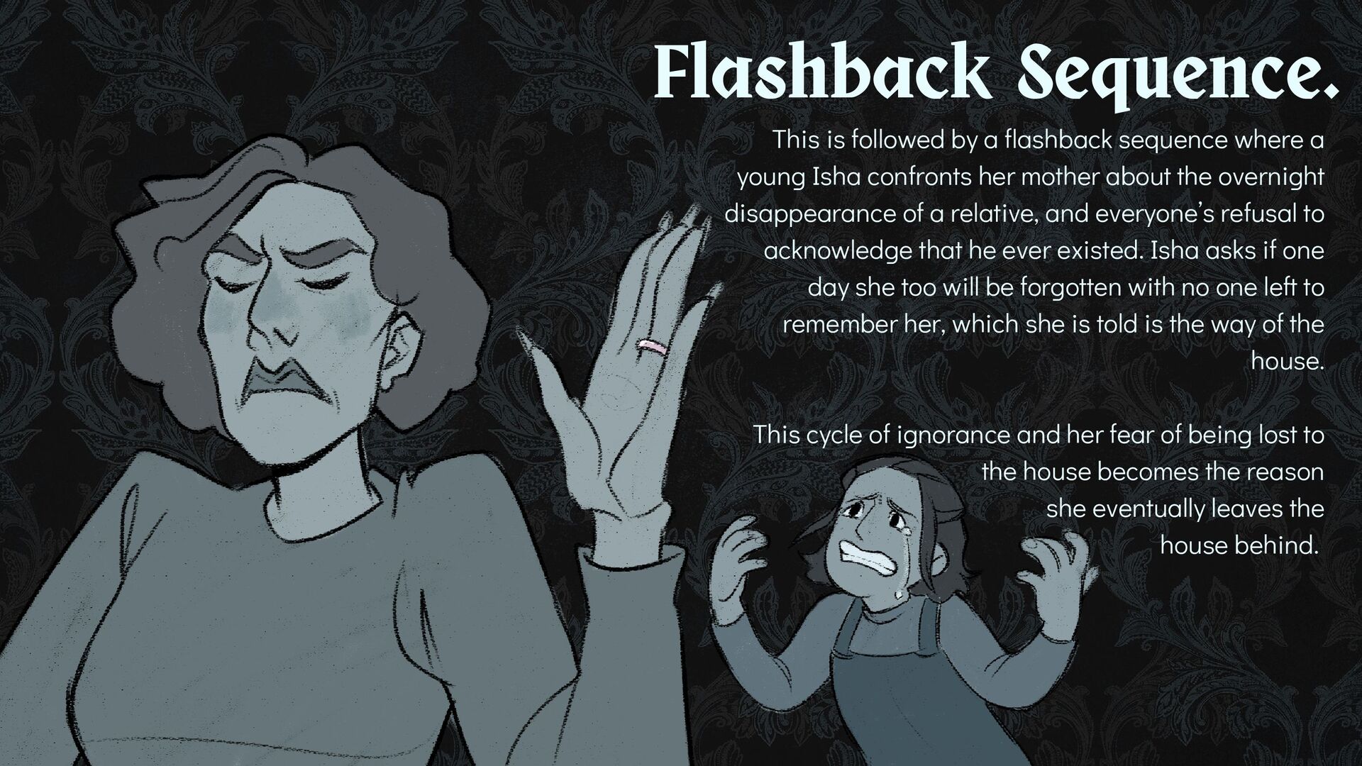 Isha confronts her mother about the overnight disappearance of a relative, and everyone’s refusal to acknowledge that he ever existed. Isha asks if one day she too will be forgotten with no one left to remember her, which she is told is the way of the house. This cycle of ignorance and her fear of being lost to the house becomes the reason she eventually leaves the house behind. Flashback Sequence.