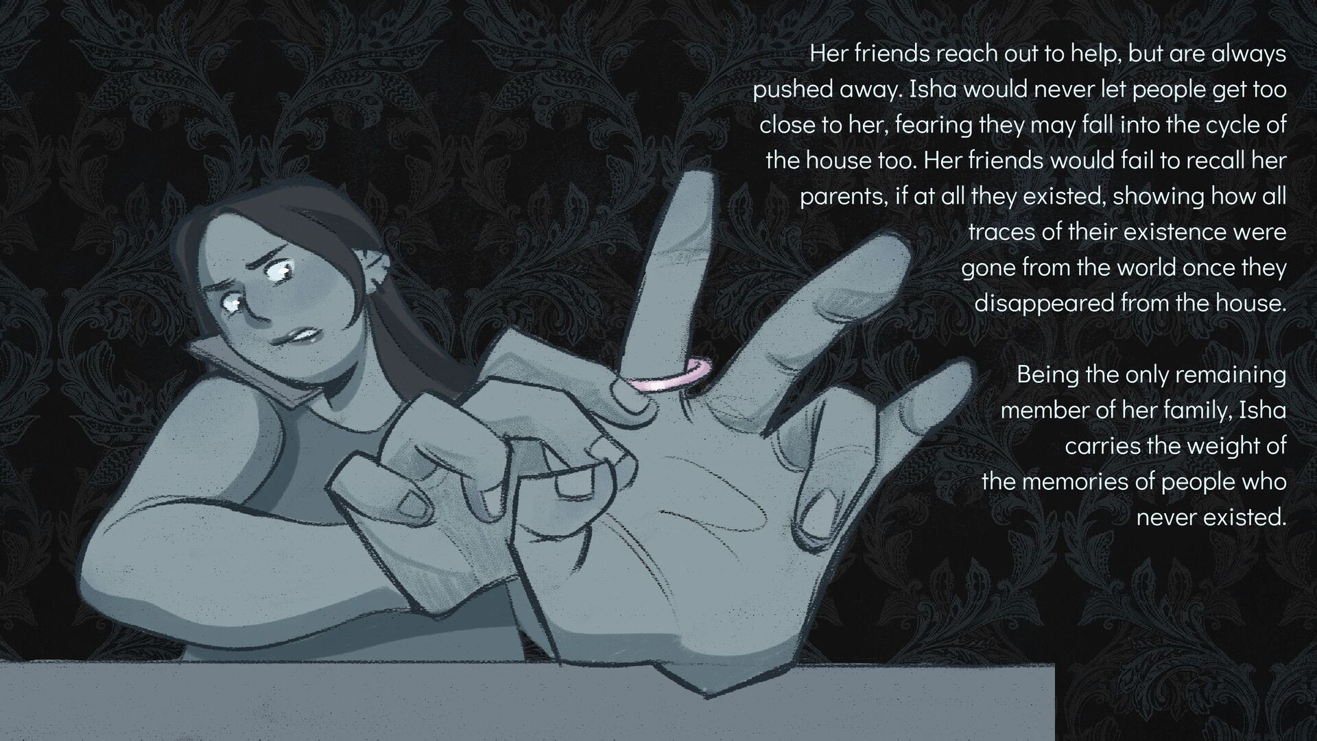 away. Isha would never let people get too close to her, fearing they may fall into the cycle of the house too. Her friends would fail to recall her parents, if at all they existed, showing how all traces of their existence were gone from the world once they disappeared from the house. Being the only remaining member of her family, Isha carries the weight of the memories of people who never existed.