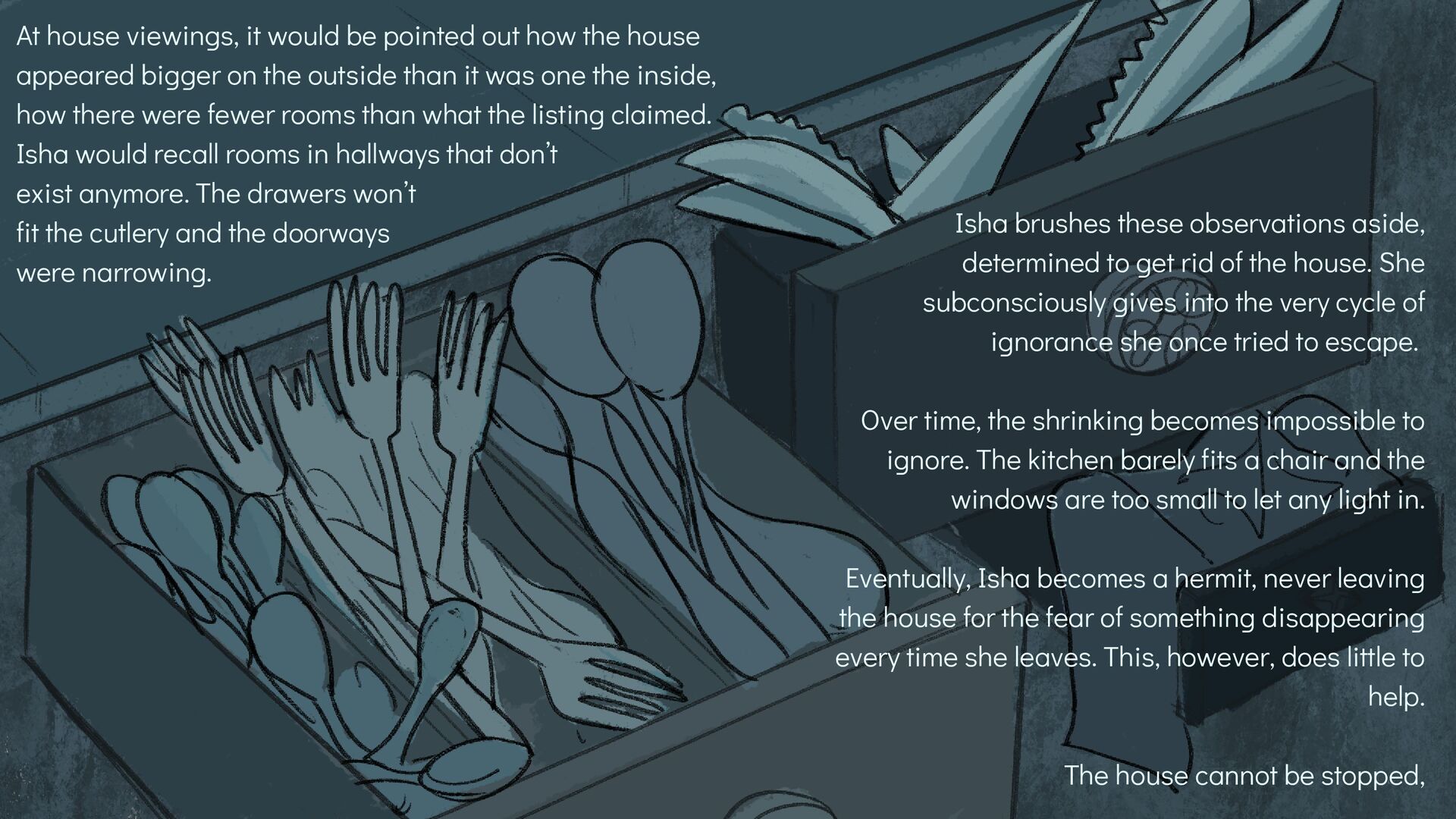 house appeared bigger on the outside than it was one the inside, how there were fewer rooms than what the listing claimed. Isha would recall rooms in hallways that don’t exist anymore. The drawers won’t fit the cutlery and the doorways were narrowing. Isha brushes these observations aside, determined to get rid of the house. She subconsciously gives into the very cycle of ignorance she once tried to escape. Over time, the shrinking becomes impossible to ignore. The kitchen barely fits a chair and the windows are too small to let any light in. Eventually, Isha becomes a hermit, never leaving the house for the fear of something disappearing every time she leaves. This, however, does little to help. The house cannot be stopped,
