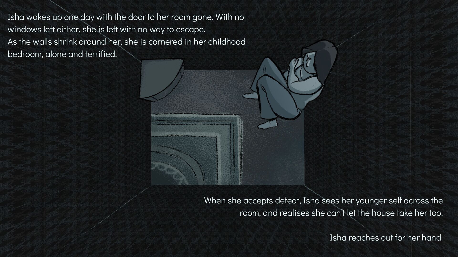 room gone. With no windows left either, she is left with no way to escape. As the walls shrink around her, she is cornered in her childhood bedroom, alone and terrified. When she accepts defeat, Isha sees her younger self across the room, and realises she can’t let the house take her too. Isha reaches out for her hand.