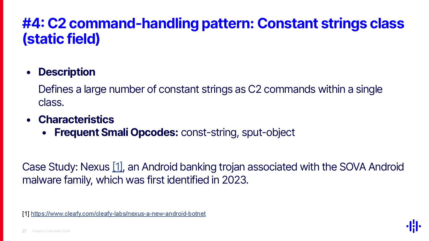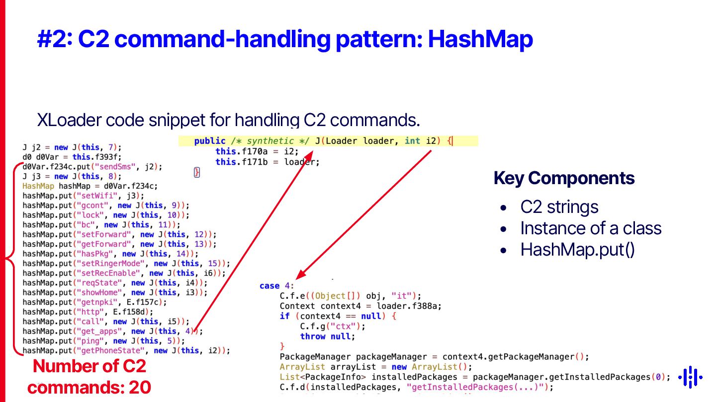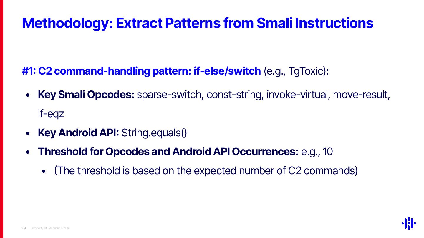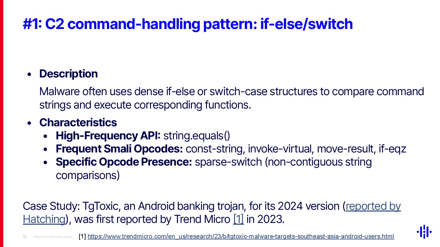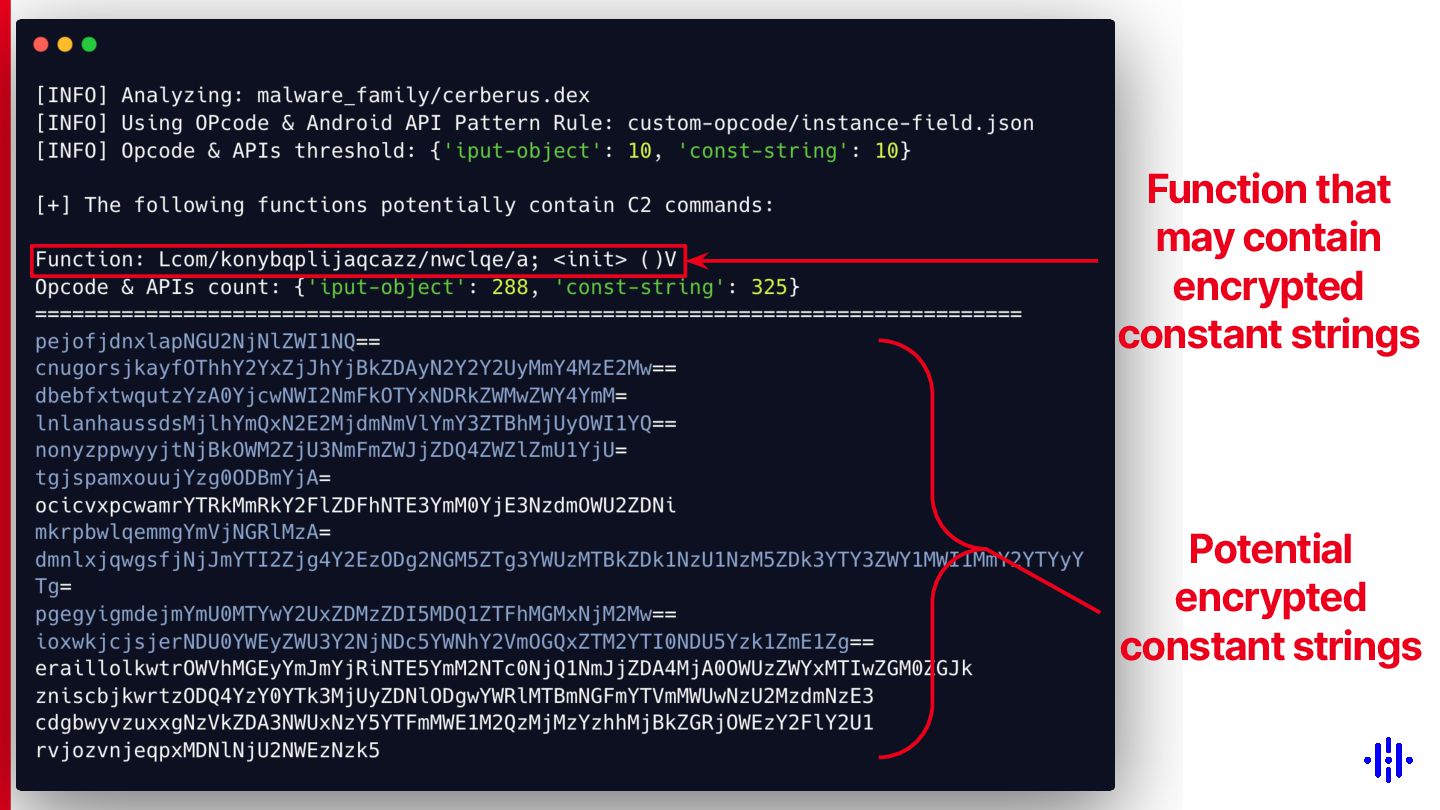 Our approach detects structured patterns in malware code, particularly multiple string comparisons within if-else and switch statements, and HashMap-based C2 command mappings that associate command strings with specific functions. Even when C2 commands are encrypted or obfuscated, these structures remain identifiable through Smali opcode analysis. By analysing the frequency and distribution of specific opcode patterns (e.g. const-string, invoke-virtual, if-eqz) and Android API calls (e.g. equals, contains), we establish detection thresholds to identify suspicious functions. This method lets analysts quickly pinpoint areas of interest, reducing the time spent on manual code inspection and improving overall analysis efficiency.