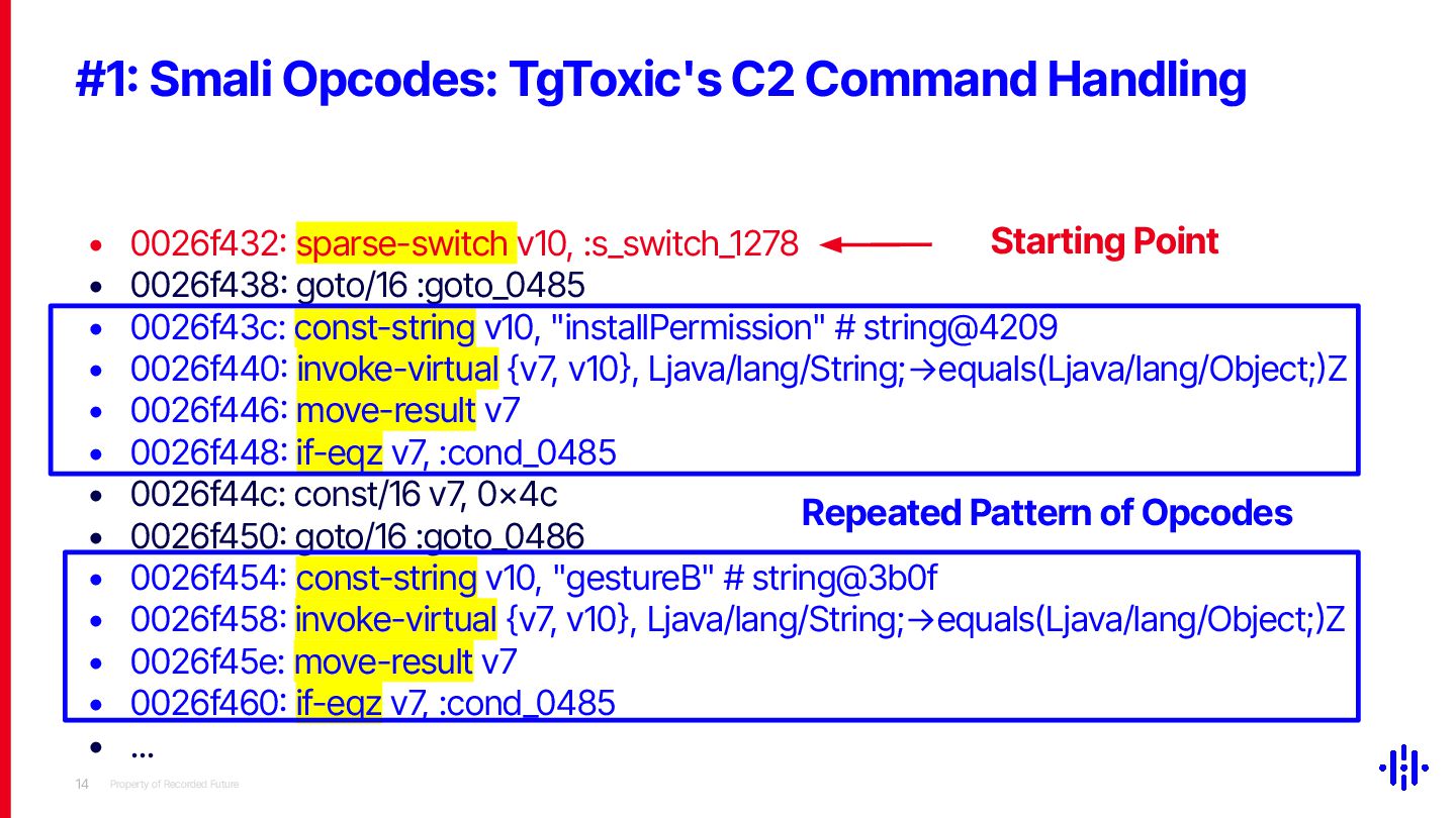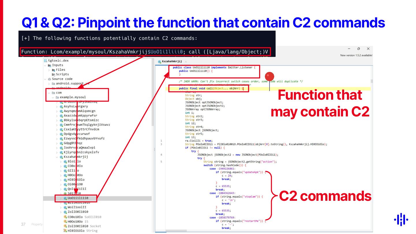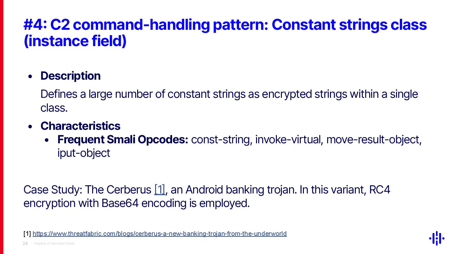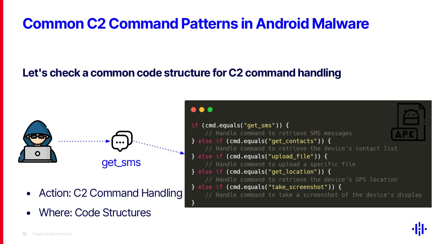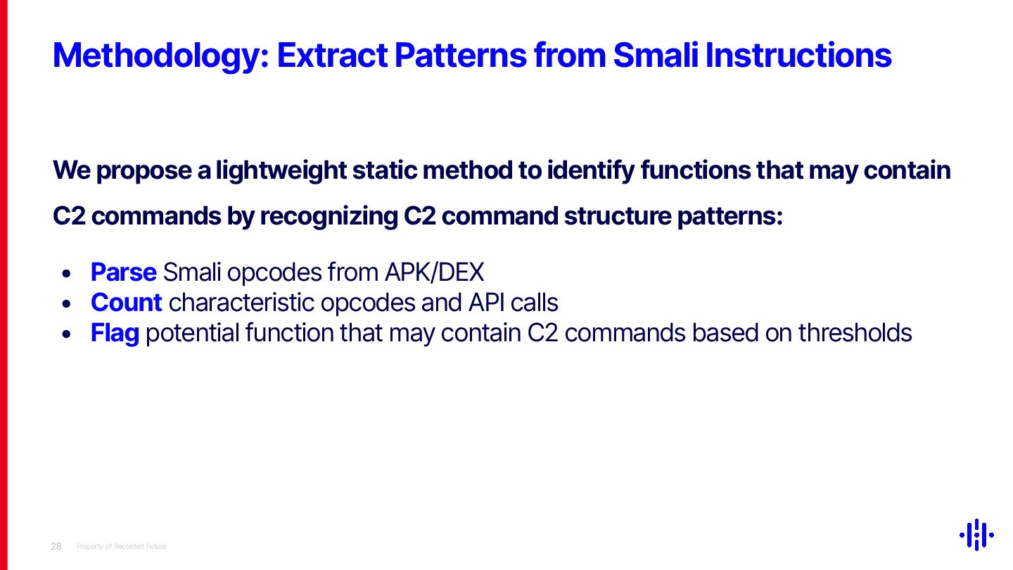 Our approach detects structured patterns in malware code, particularly multiple string comparisons within if-else and switch statements, and HashMap-based C2 command mappings that associate command strings with specific functions. Even when C2 commands are encrypted or obfuscated, these structures remain identifiable through Smali opcode analysis. By analysing the frequency and distribution of specific opcode patterns (e.g. const-string, invoke-virtual, if-eqz) and Android API calls (e.g. equals, contains), we establish detection thresholds to identify suspicious functions. This method lets analysts quickly pinpoint areas of interest, reducing the time spent on manual code inspection and improving overall analysis efficiency.