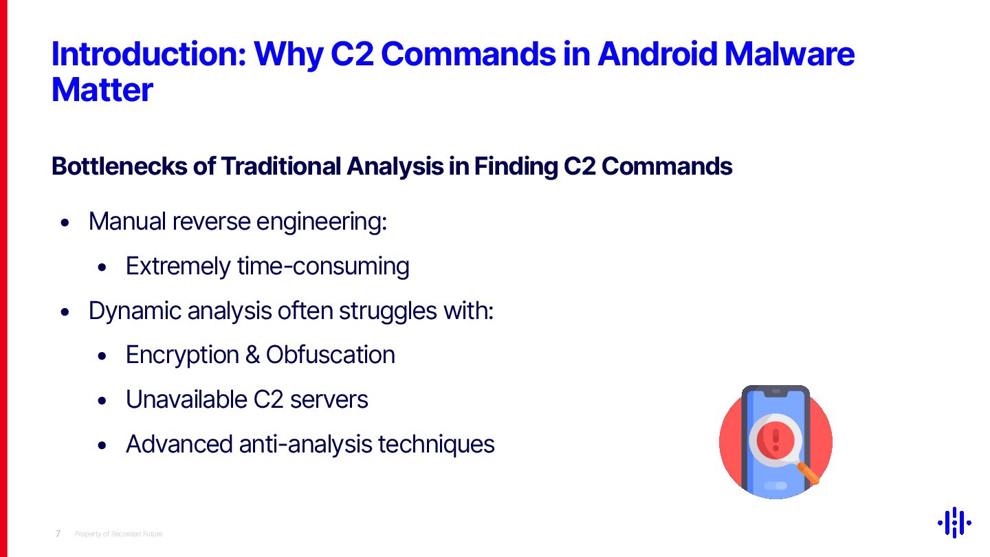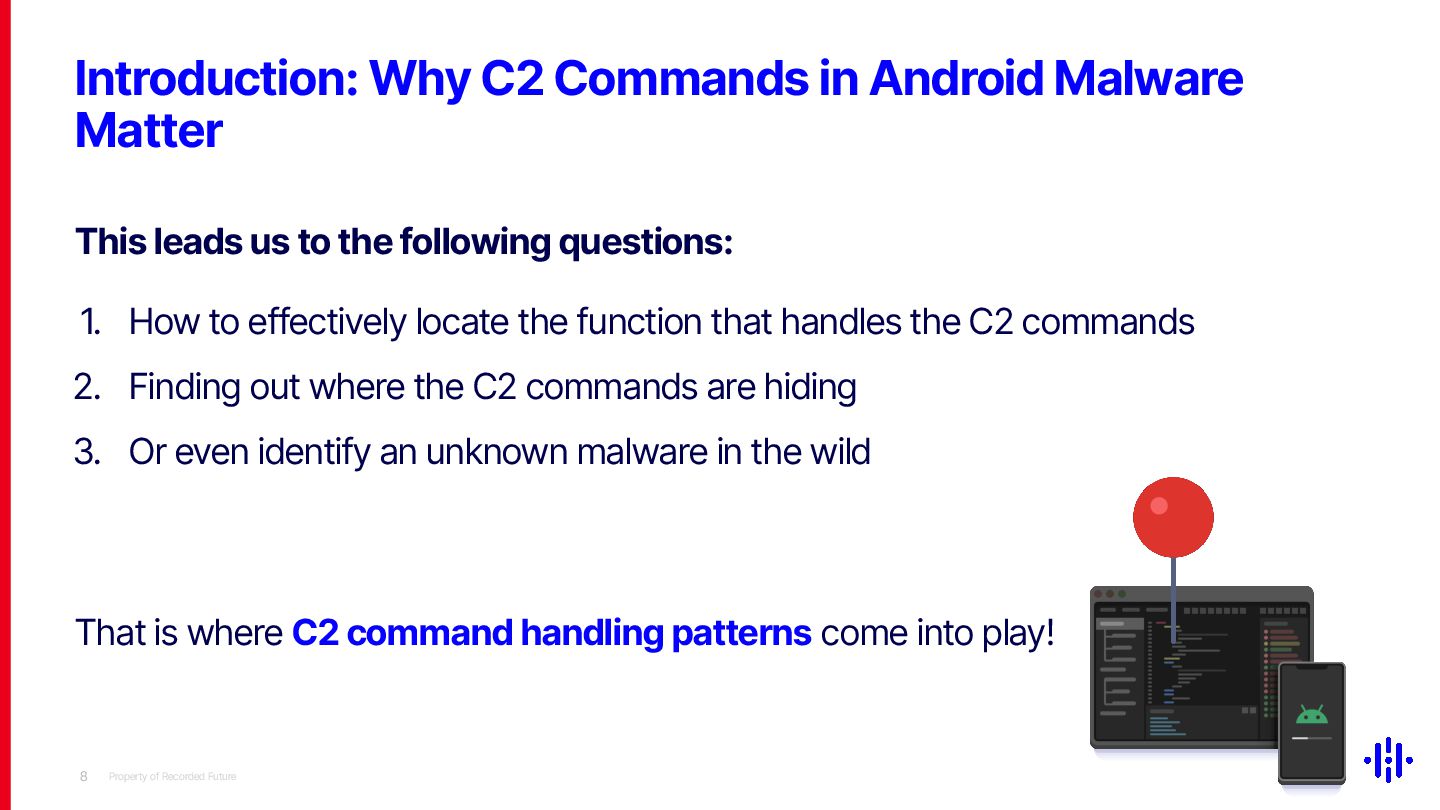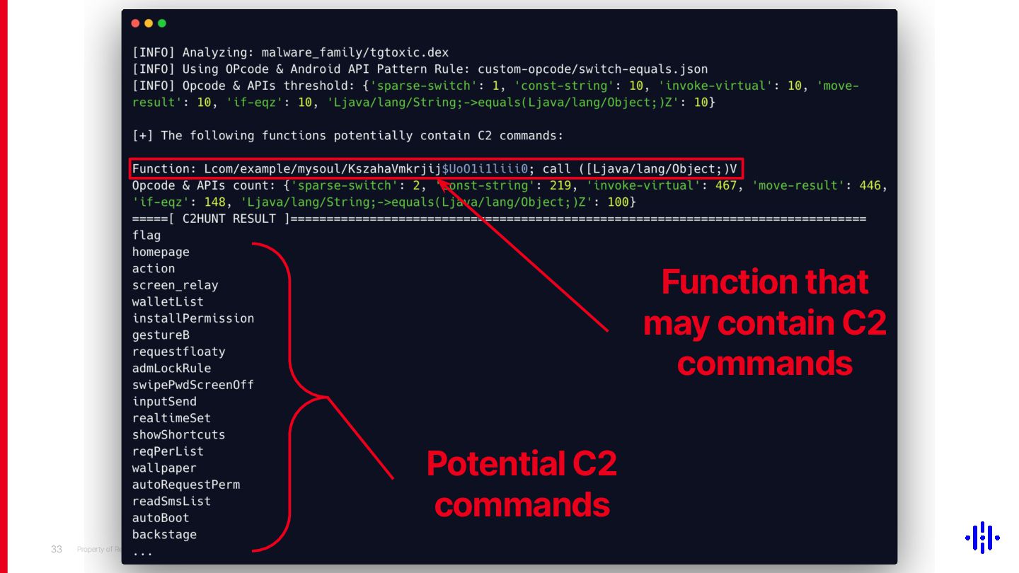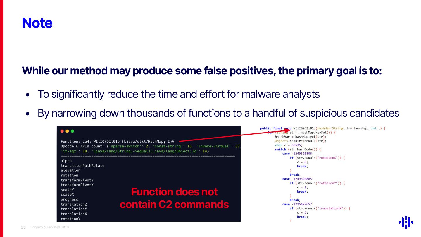 Our technique significantly narrows the investigation scope, making it a valuable tool for threat hunting and malware classification in Android malware analysis. Although our approach does not ensure that every flagged function contains C2 commands due to the varying number of C2 commands across malware families, it provides a strong basis for further research. We will share the tool implementation and comprehensive data on C2 command occurrences across malware families to support the design of detection thresholds.