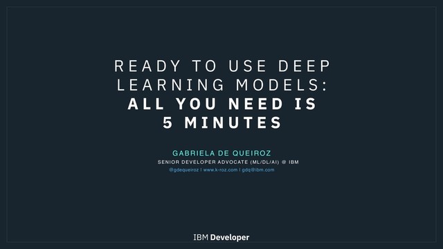 U S E D E E P L E A R N I N G M O D E L S : A L L Y O U N E E D I S 5 M I N U T E S SENI OR DEVELOPER ADVOCATE (ML /DL/A I) @ IBM @gdequeiroz | www.k-roz.com | [email protected]