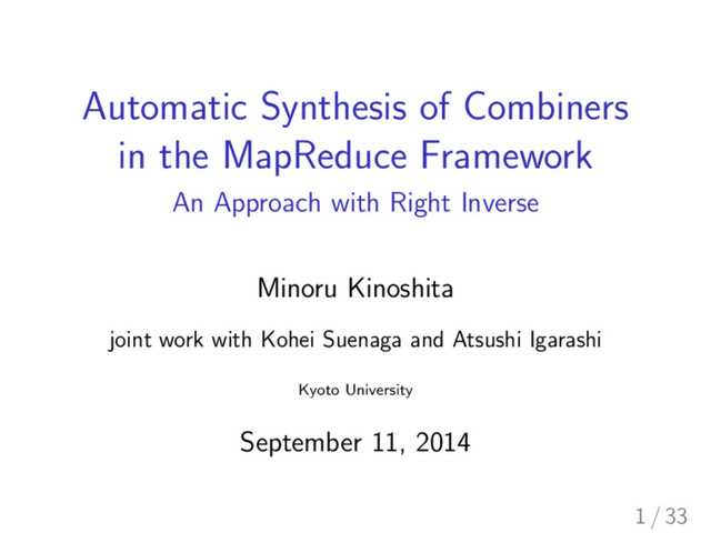 notion of the list homomorphism to MapReduce programs I Gets list homomorphism, execute MapReduce computation I Basically the same algorithm as ours I They don’t deal with combiners 31 / 33