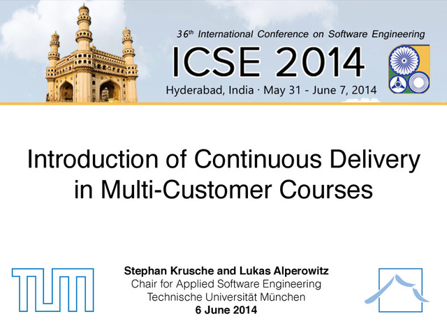 Continuous Delivery in Multi-Customer Project Courses Motivation • New trend: Continuous Delivery • Release software faster, more reliably and more frequently • Obtain feedback from clients ➡ Goal: Ability to release a single change in your software to your clients with one click • Main question: Can we teach this in university project courses? 2