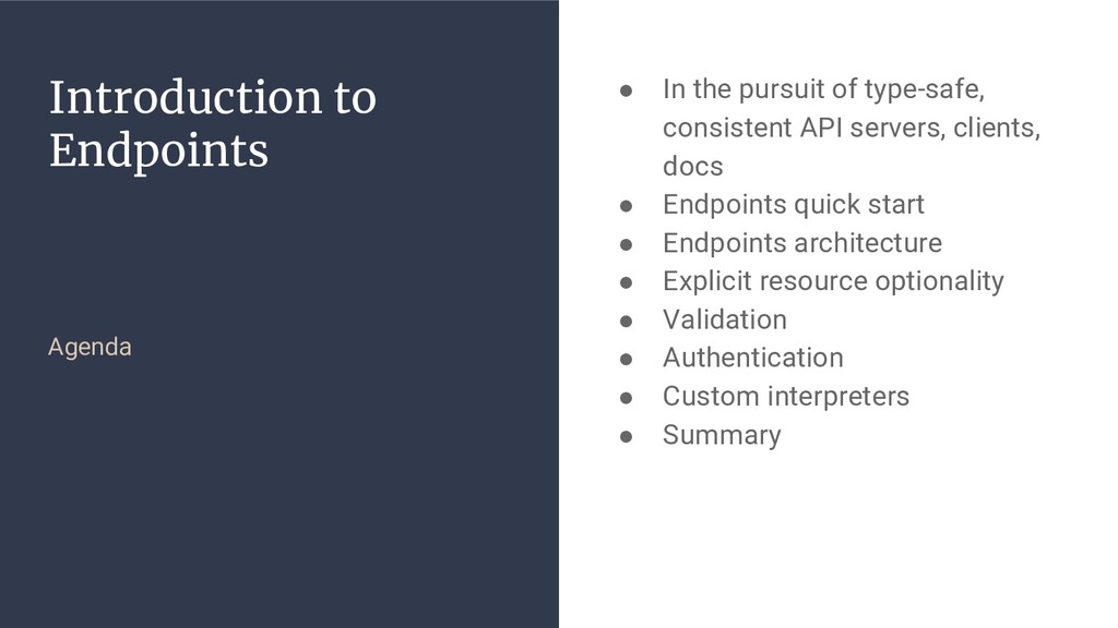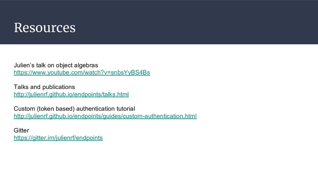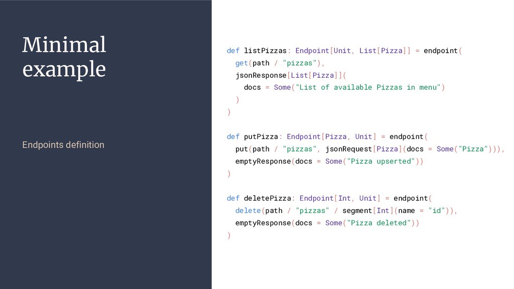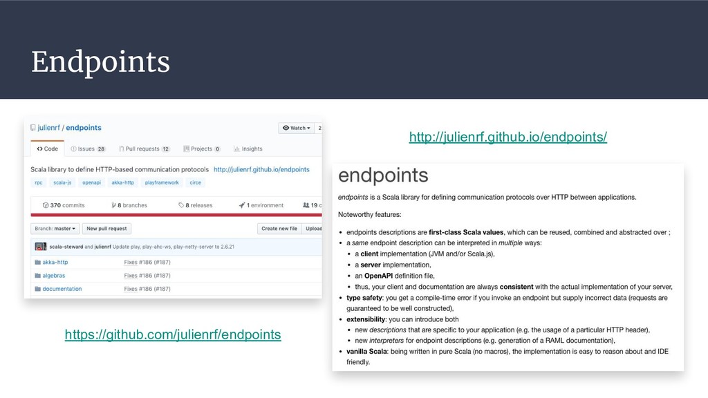 Endpoints is a Scala library for defining communication protocols over HTTP between applications. It allows to describe API endpoints as first-class Scala values and interpret them in multiple ways: as server, client or documentation making sure documentation is always consistent with server implementation.