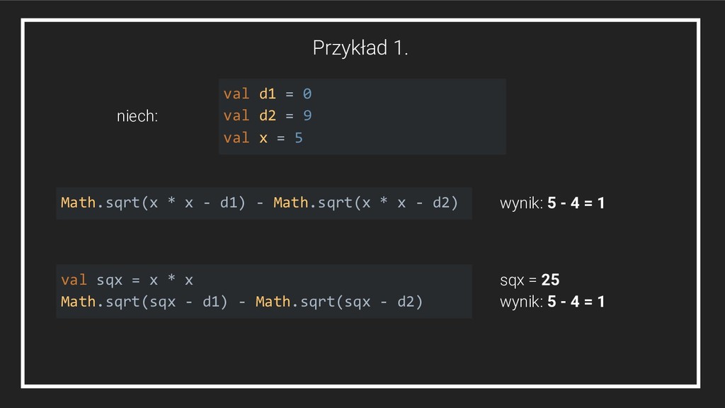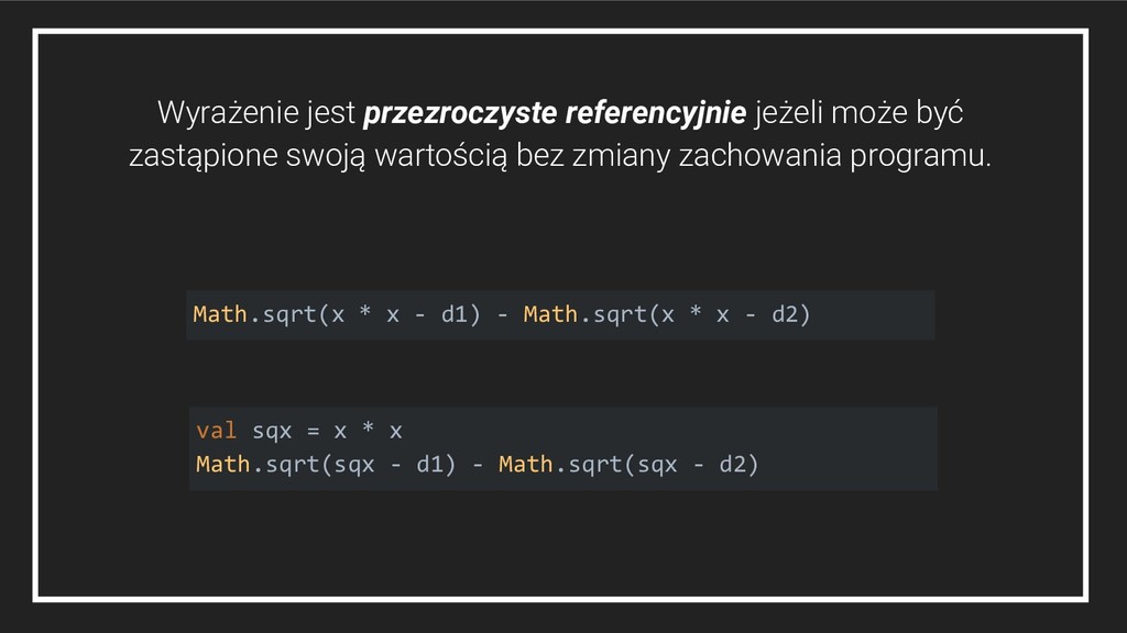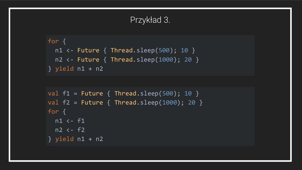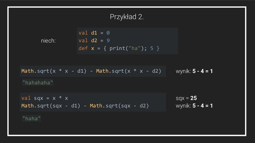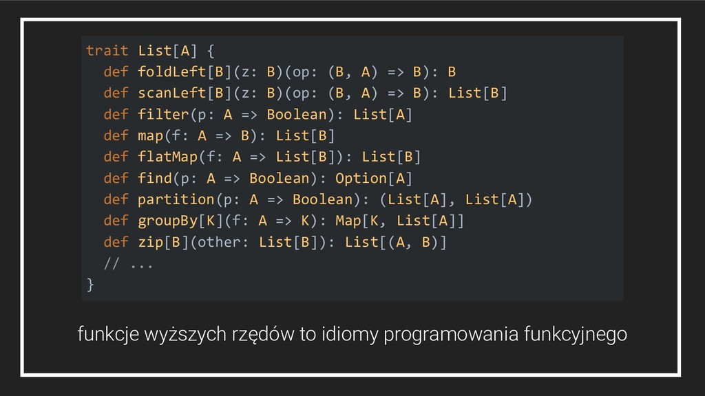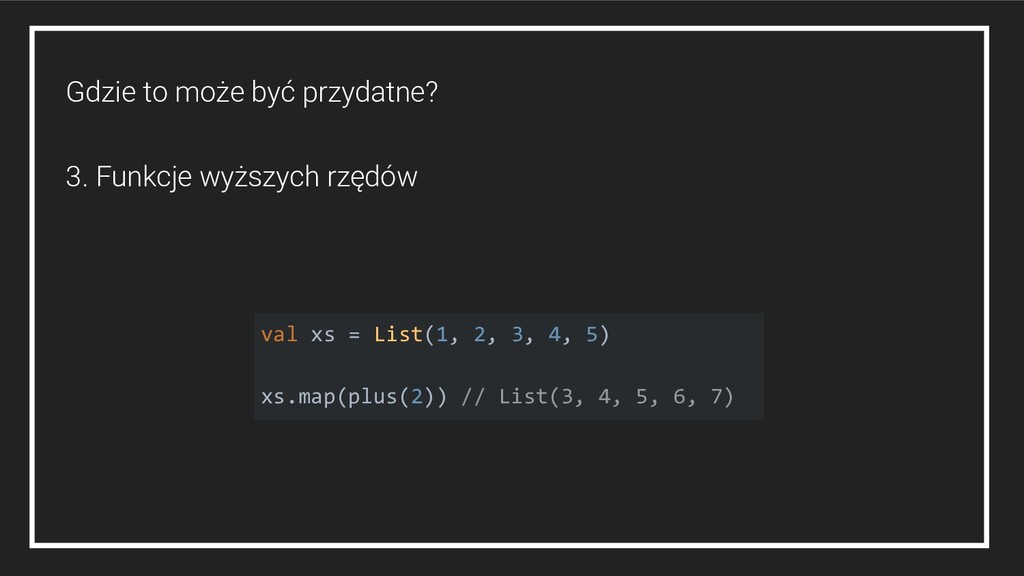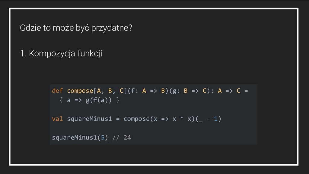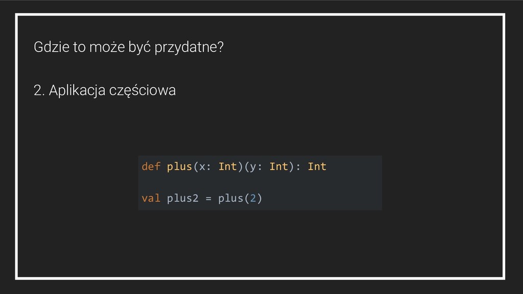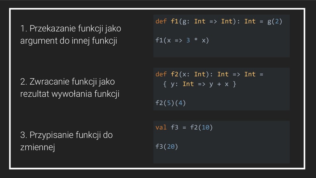 funkcji jako rezultat wywołania funkcji 3. Przypisanie funkcji do zmiennej def f1(g: Int => Int): Int = g(2) f1(x => 3 * x) def f2(x: Int): Int => Int = { y: Int => y + x } f2(5)(4) val f3 = f2(10) f3(20)