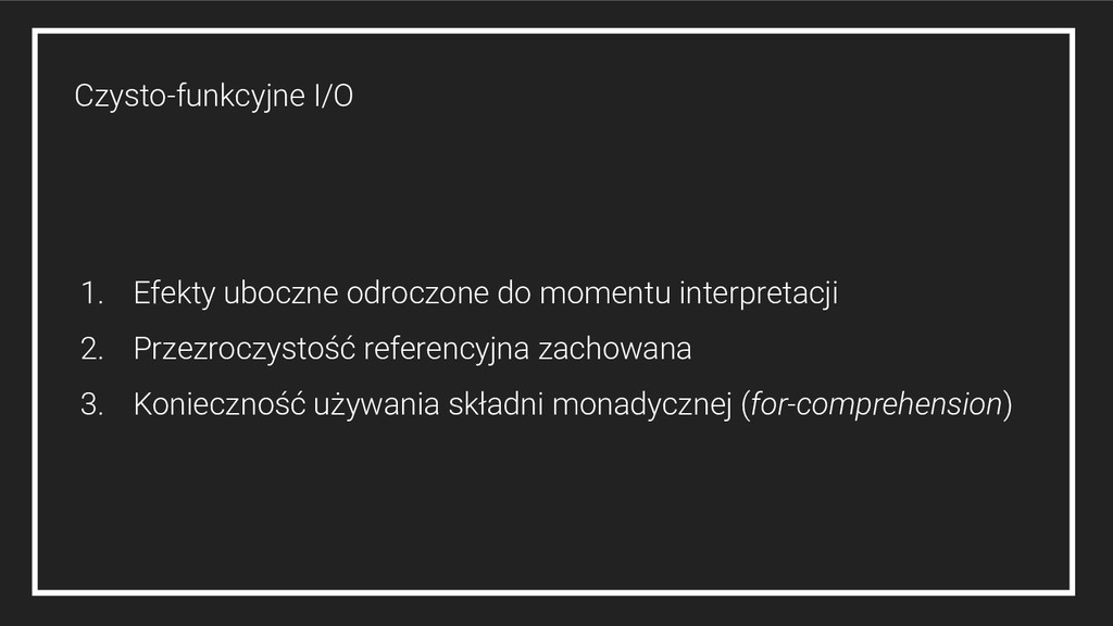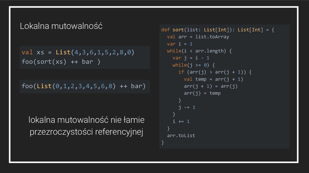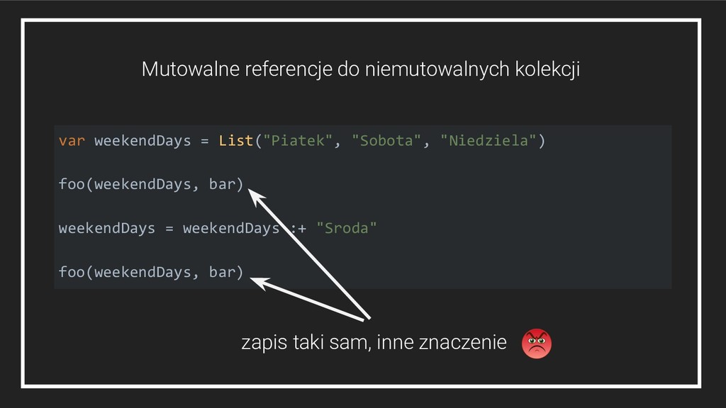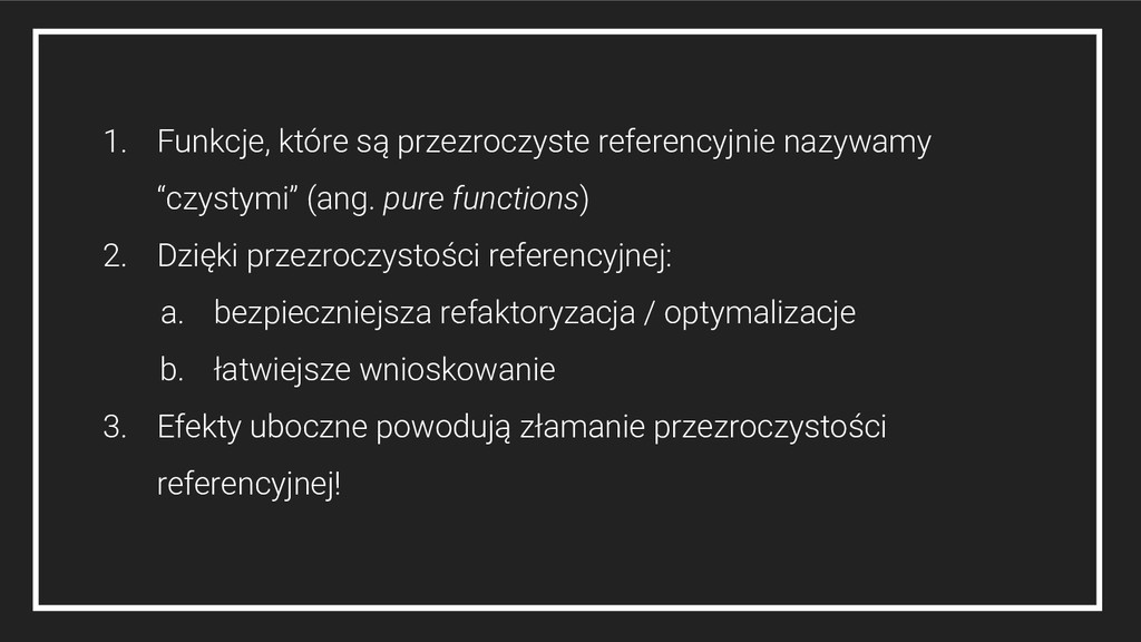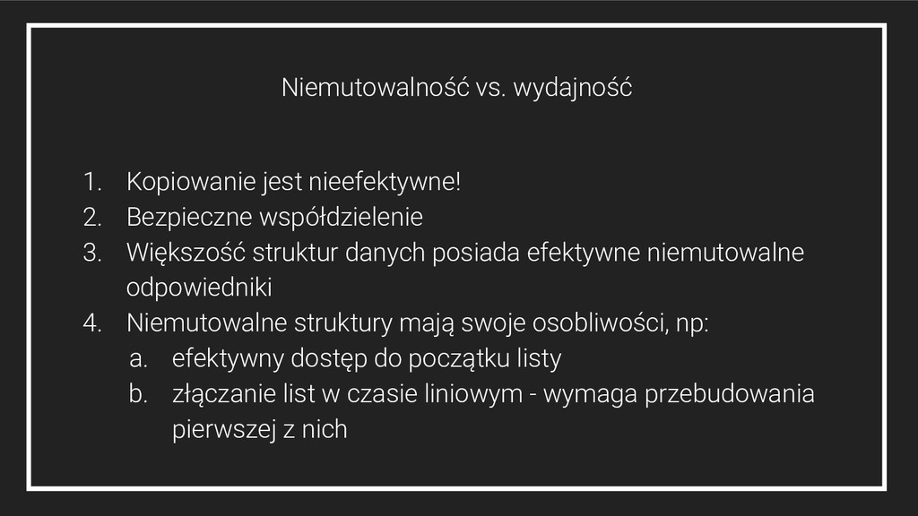 3. Większość struktur danych posiada efektywne niemutowalne odpowiedniki 4. Niemutowalne struktury mają swoje osobliwości, np: a. efektywny dostęp do początku listy b. złączanie list w czasie liniowym - wymaga przebudowania pierwszej z nich
