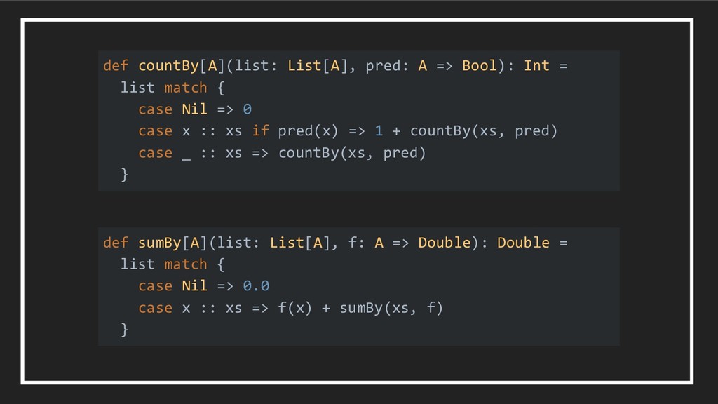 match { case Nil => 0 case x :: xs if pred(x) => 1 + countBy(xs, pred) case _ :: xs => countBy(xs, pred) } def sumBy[A](list: List[A], f: A => Double): Double = list match { case Nil => 0.0 case x :: xs => f(x) + sumBy(xs, f) }