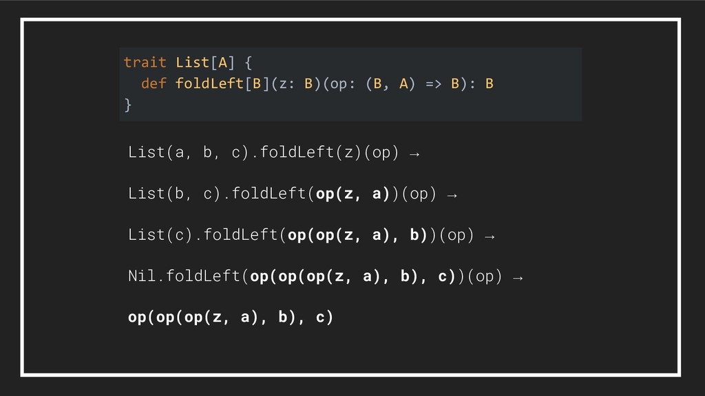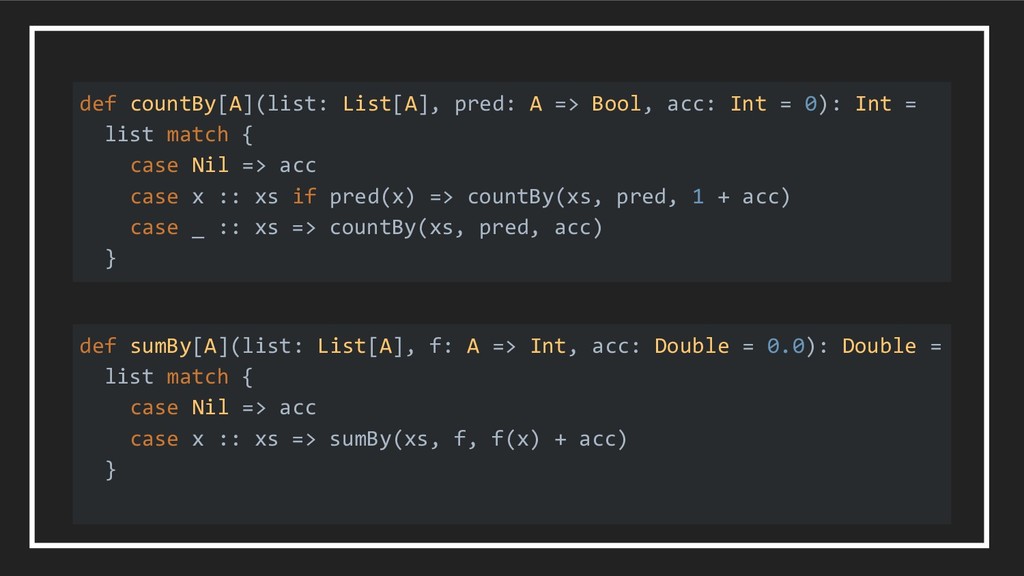 0.0): Double = list match { case Nil => acc case x :: xs => sumBy(xs, f, f(x) + acc) } def countBy[A](list: List[A], pred: A => Bool, acc: Int = 0): Int = list match { case Nil => acc case x :: xs if pred(x) => countBy(xs, pred, 1 + acc) case _ :: xs => countBy(xs, pred, acc) }