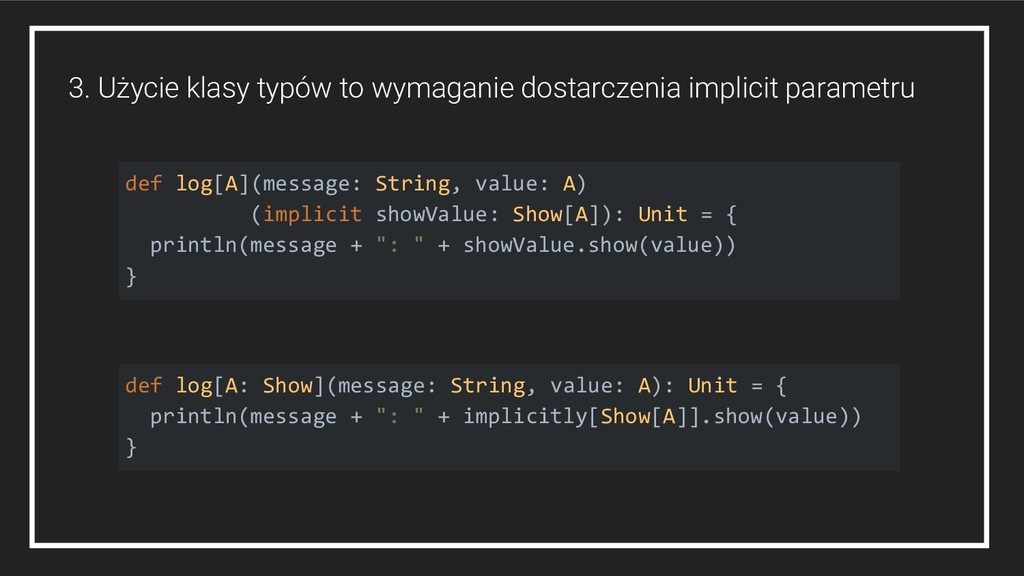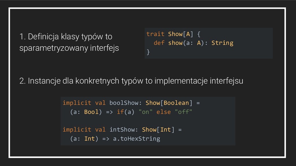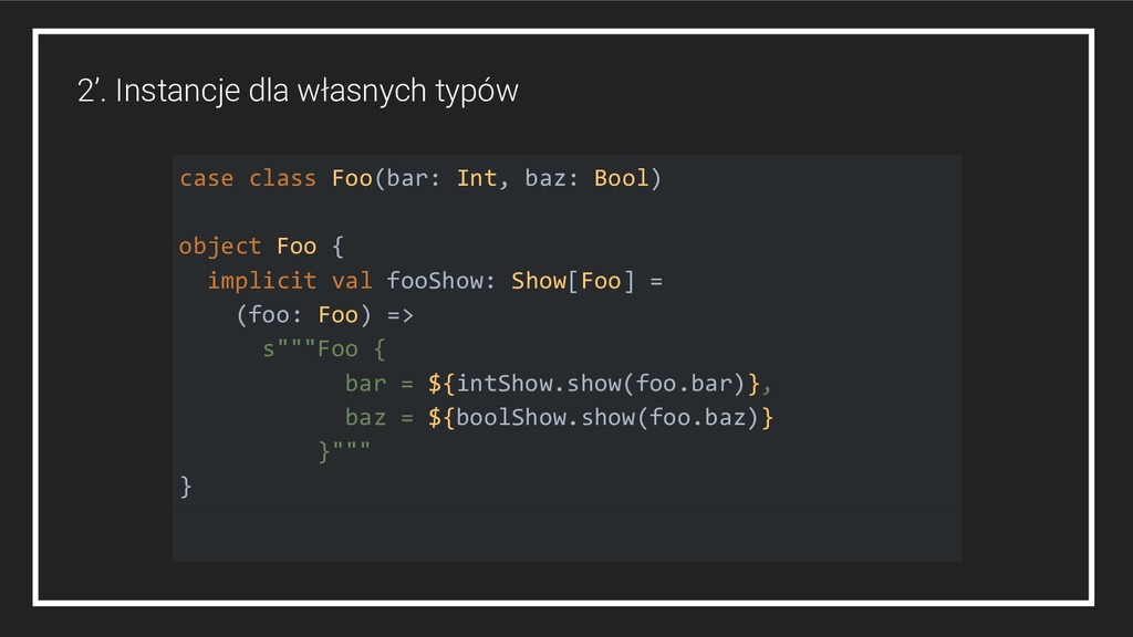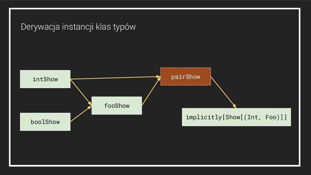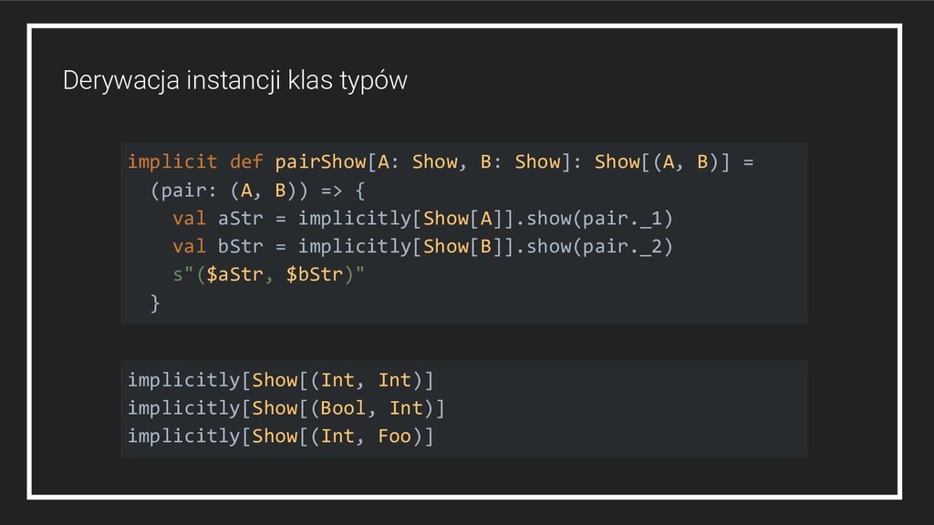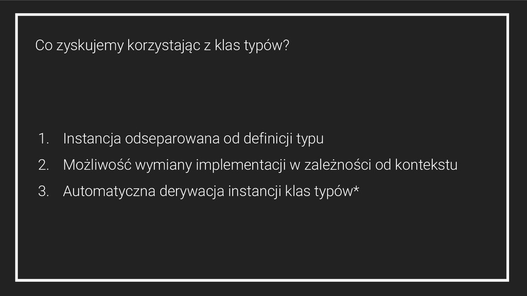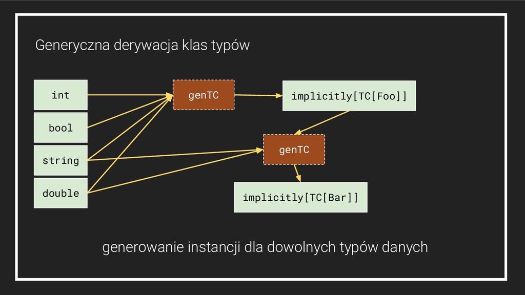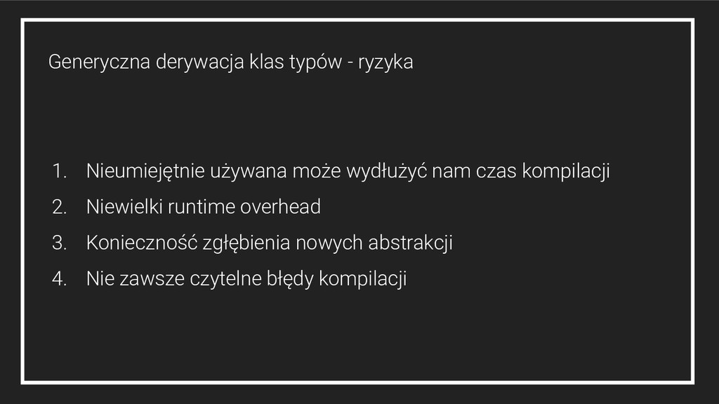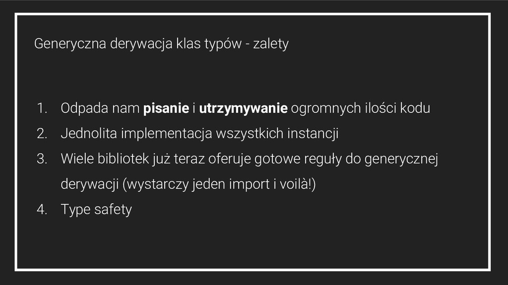 i utrzymywanie ogromnych ilości kodu 2. Jednolita implementacja wszystkich instancji 3. Wiele bibliotek już teraz oferuje gotowe reguły do generycznej derywacji (wystarczy jeden import i voilà!) 4. Type safety