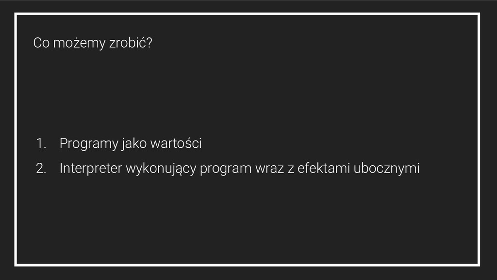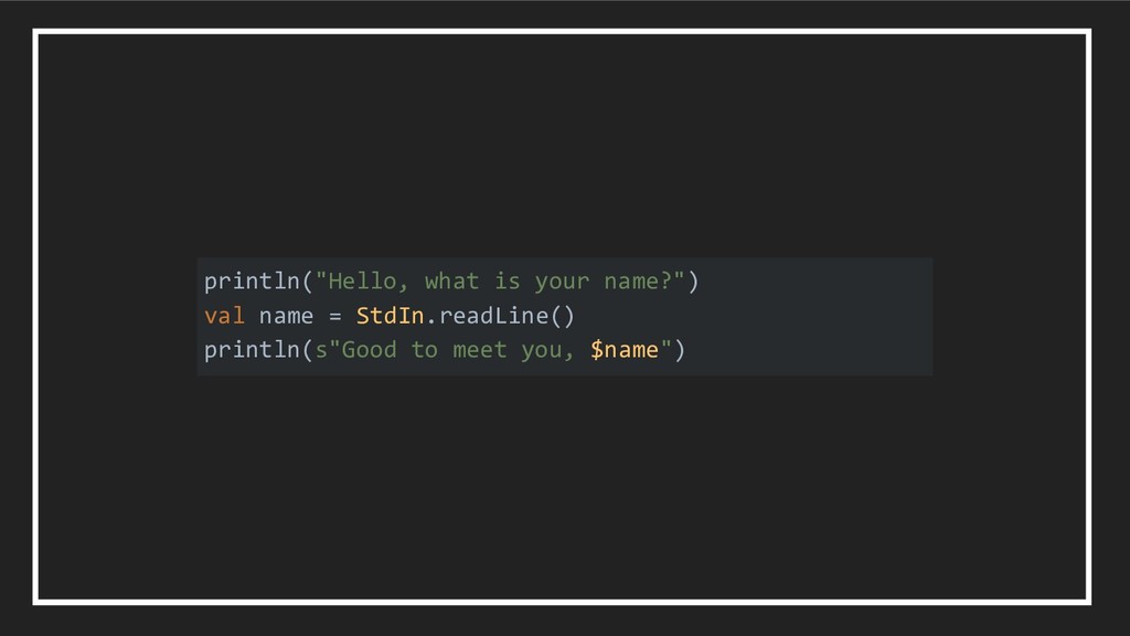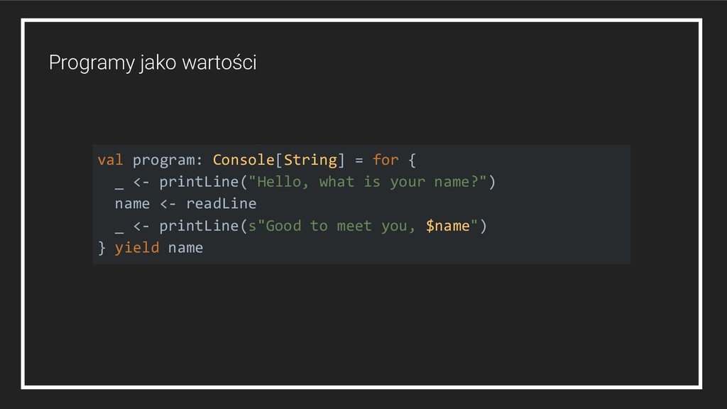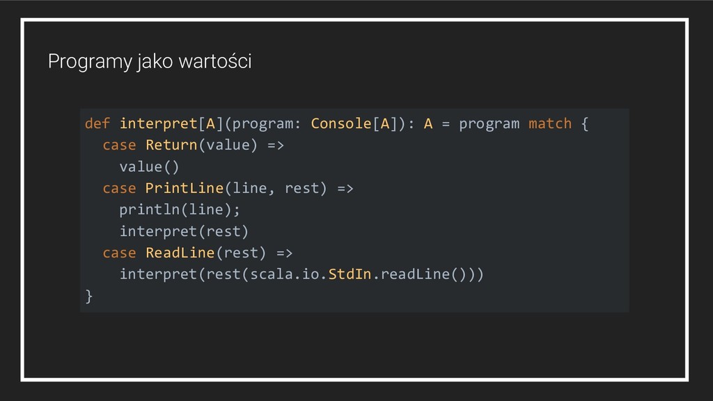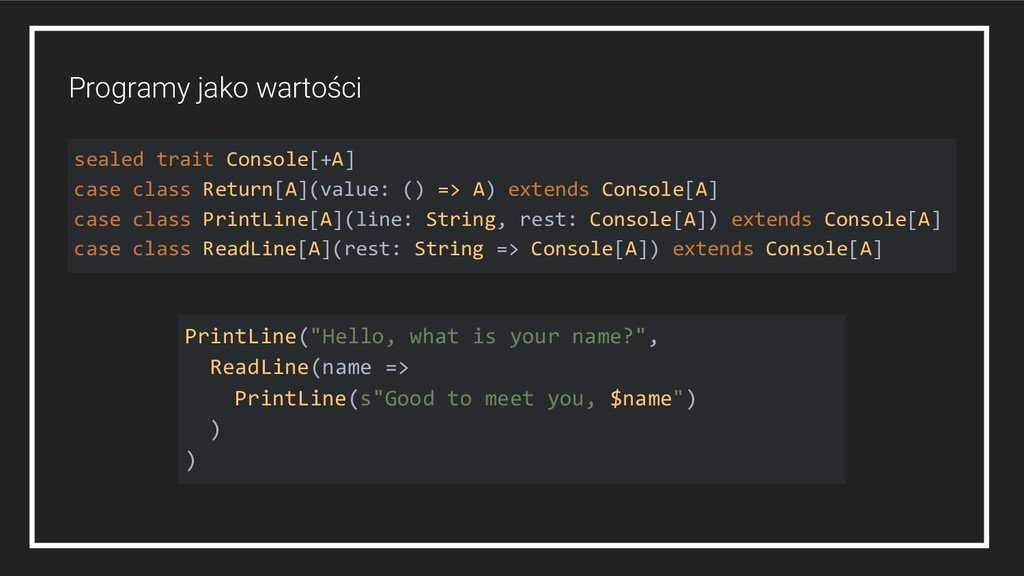 => A) extends Console[A] case class PrintLine[A](line: String, rest: Console[A]) extends Console[A] case class ReadLine[A](rest: String => Console[A]) extends Console[A] PrintLine("Hello, what is your name?", ReadLine(name => PrintLine(s"Good to meet you, $name") ) )