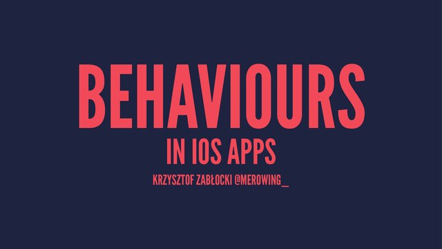 binding: ▸ Behaviour will decide how long to keep itself alive ▸ Removing behaviour or adding new ones will NOT require modifying controller code. - (void)bindLifetimeToObject:(id)object { objc_setAssociatedObject(object, (__bridge void *)self, self, OBJC_ASSOCIATION_RETAIN_NONATOMIC); } - (void)releaseLifetimeFromObject:(id)object { objc_setAssociatedObject(object, (__bridge void *)self, nil, OBJC_ASSOCIATION_RETAIN_NONATOMIC); }