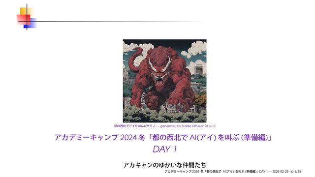 2024年2月23日(金・祝)、東京にて開催されたアカデミーキャンプ 2024冬「都の西北でAI(アイ) を叫ぶ(準備編)」DAY 1 にて使用したスライドです。