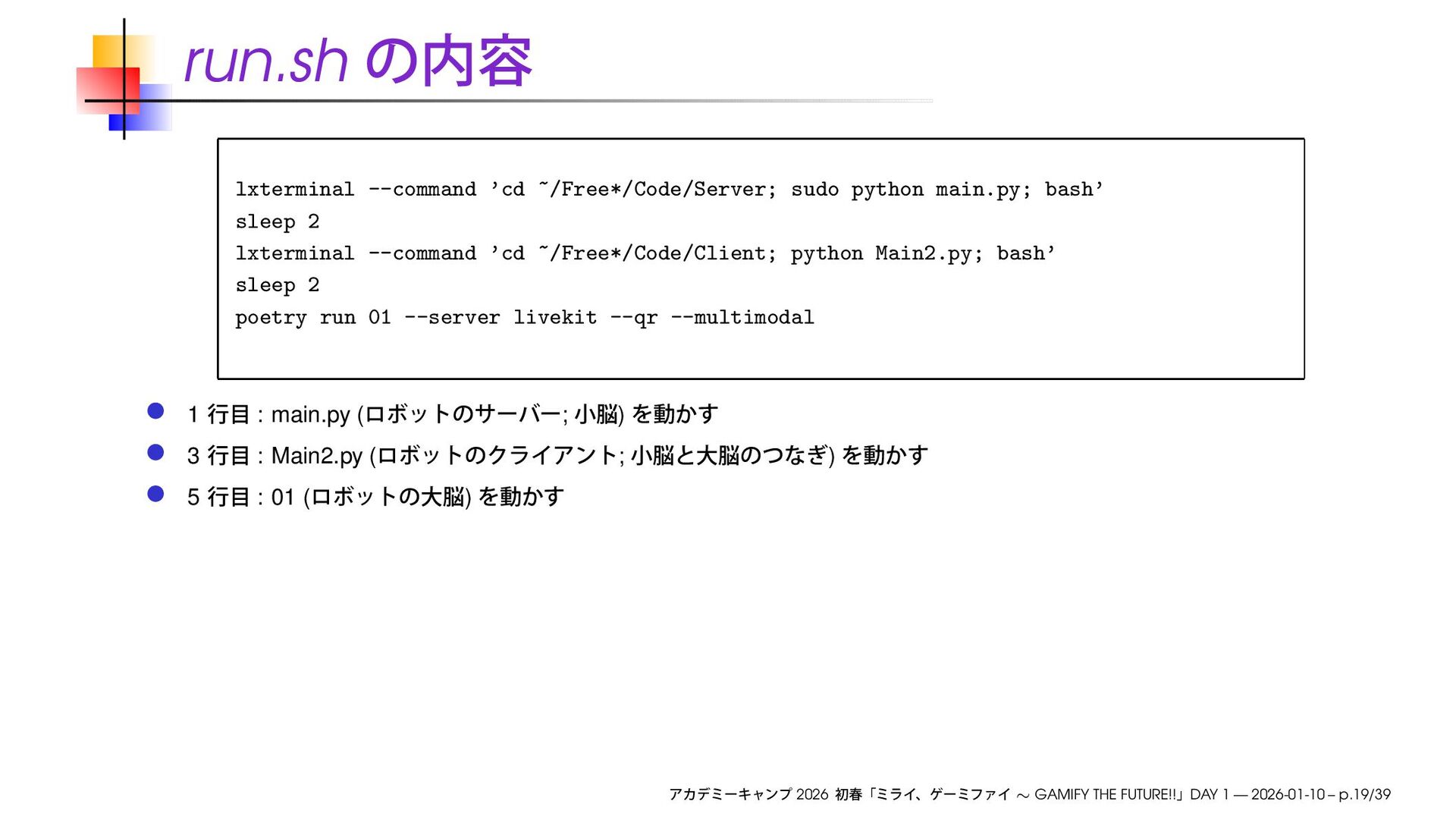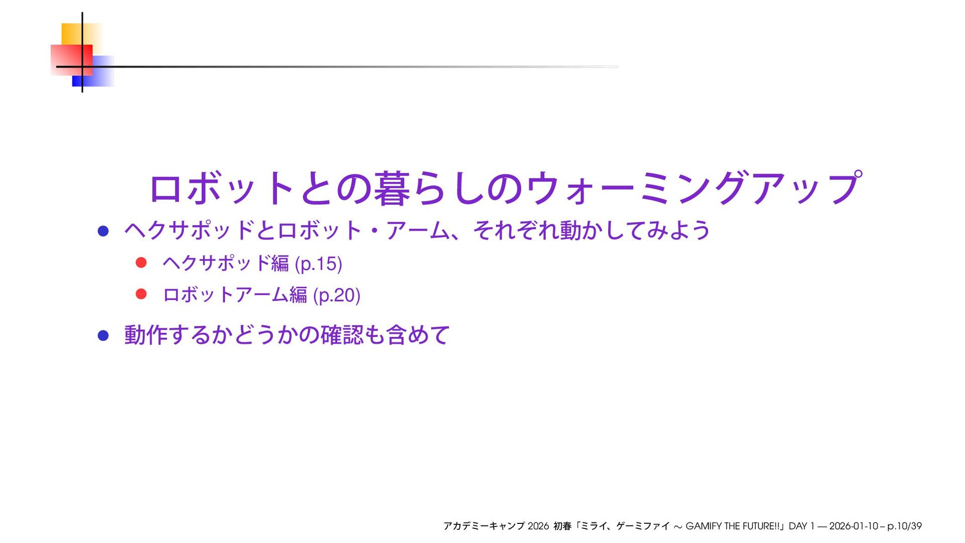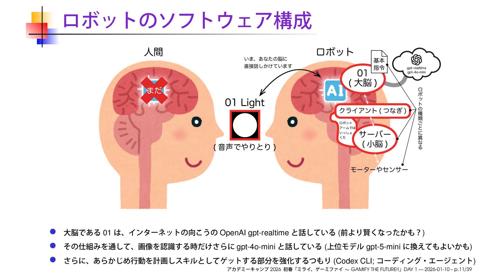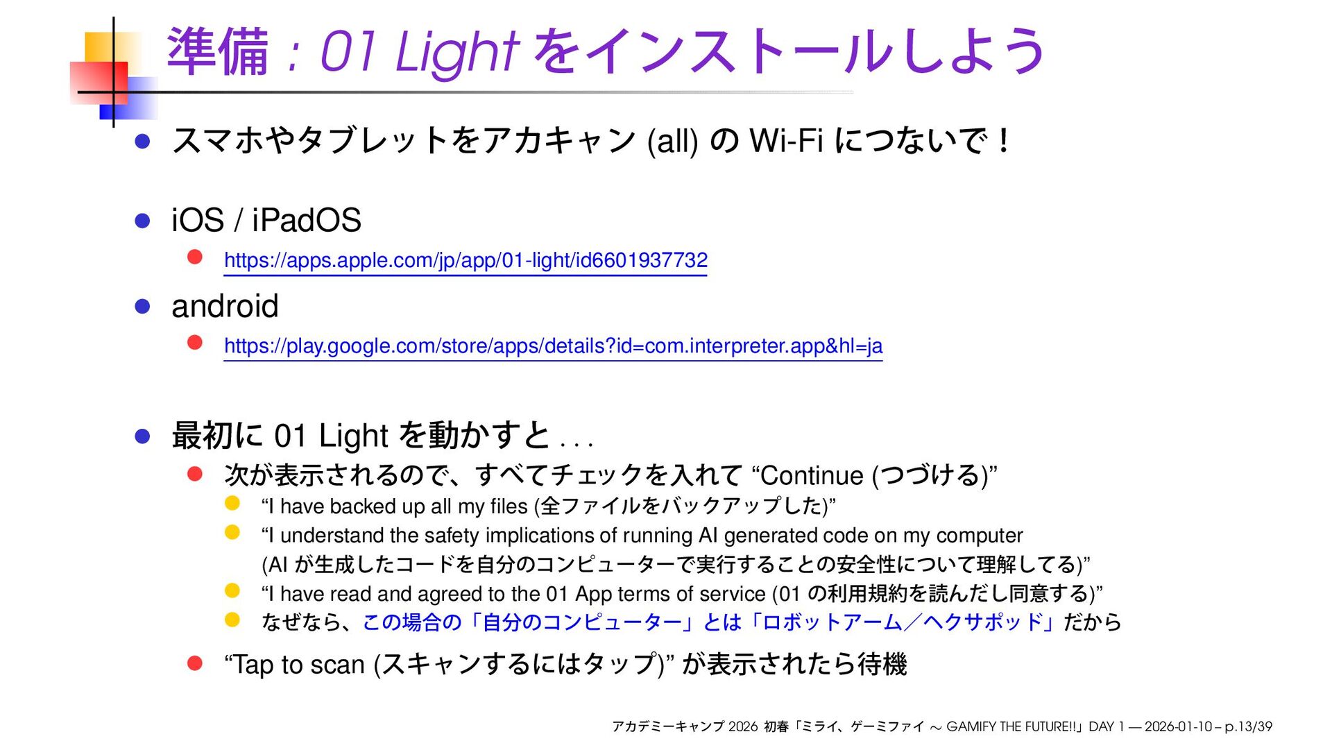 https://play.google.com/store/apps/details?id=com.interpreter.app&hl=ja 01 Light . . . “Continue ( )” “I have backed up all my files ( )” “I understand the safety implications of running AI generated code on my computer (AI )” “I have read and agreed to the 01 App terms of service (01 )” “Tap to scan ( )” 2026 ∼ GAMIFY THE FUTURE!! DAY 1 — 2026-01-10 – p.13/39