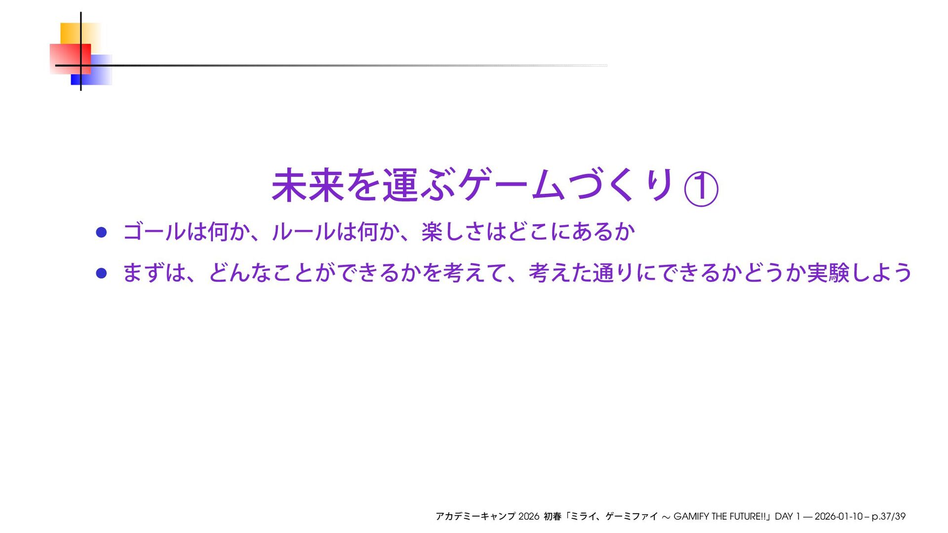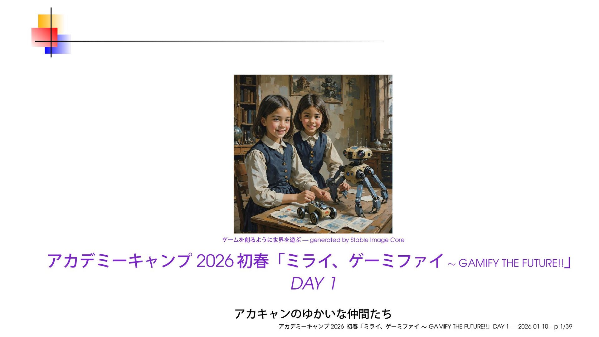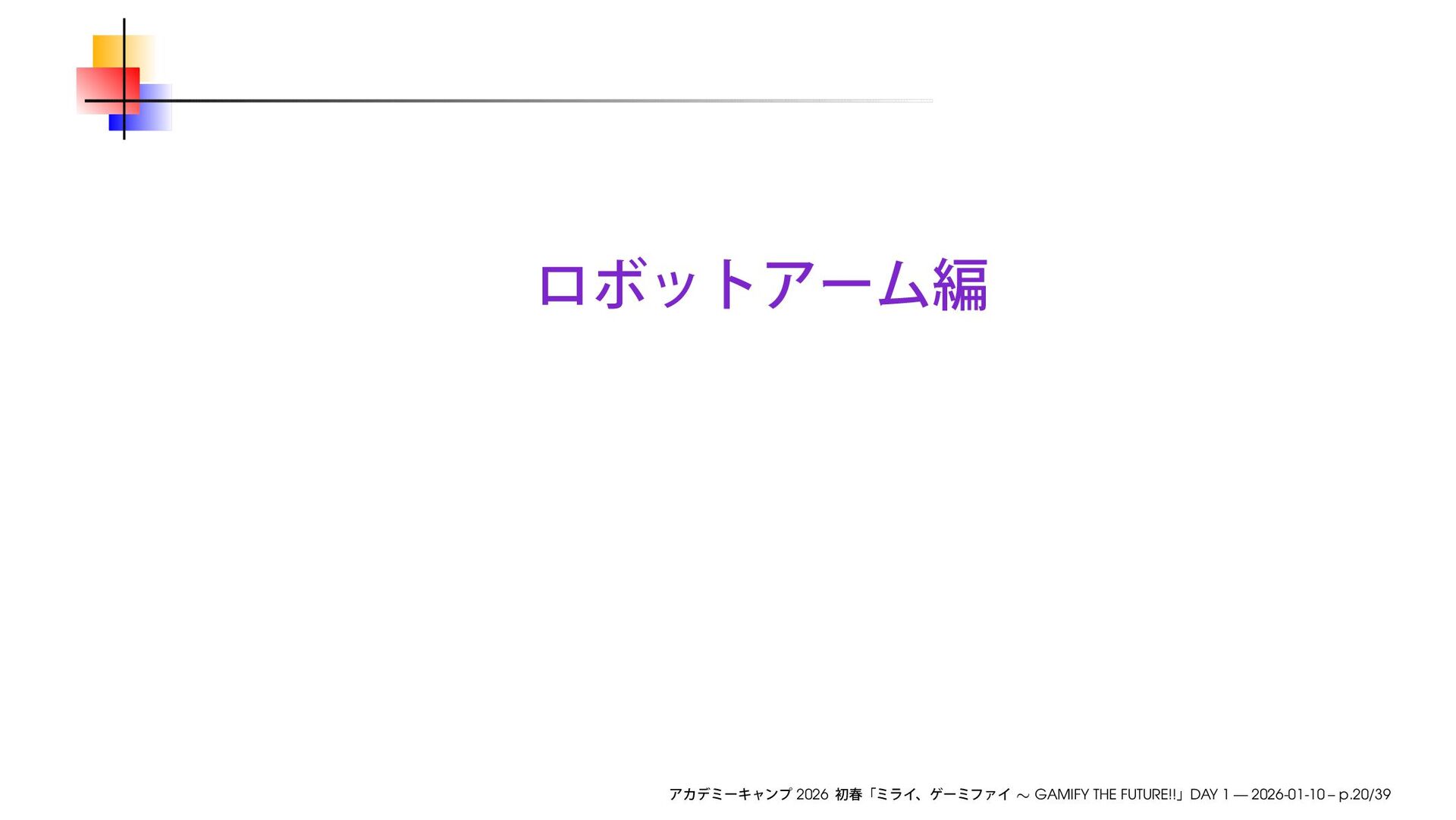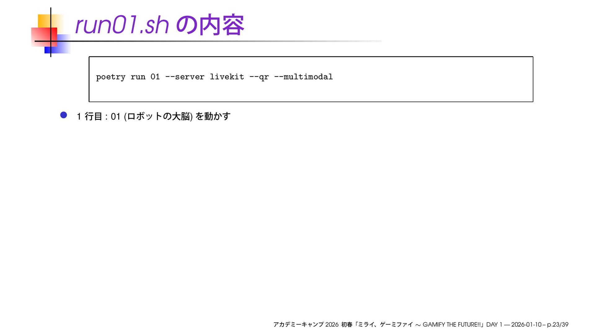 https://play.google.com/store/apps/details?id=com.interpreter.app&hl=ja 01 Light . . . “Continue ( )” “I have backed up all my files ( )” “I understand the safety implications of running AI generated code on my computer (AI )” “I have read and agreed to the 01 App terms of service (01 )” “Tap to scan ( )” 2026 ∼ GAMIFY THE FUTURE!! DAY 1 — 2026-01-10 – p.13/39