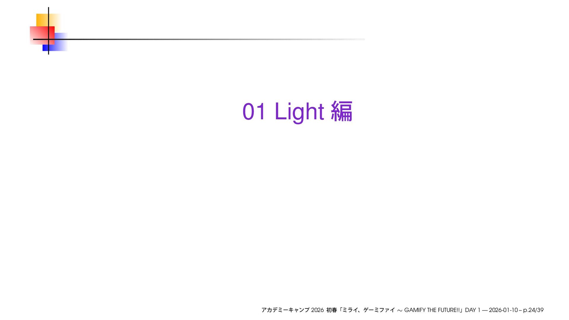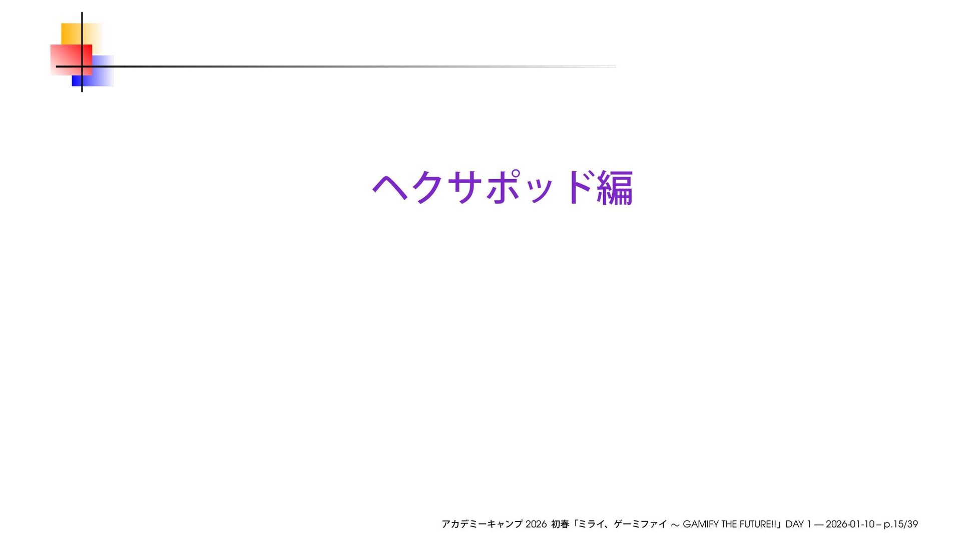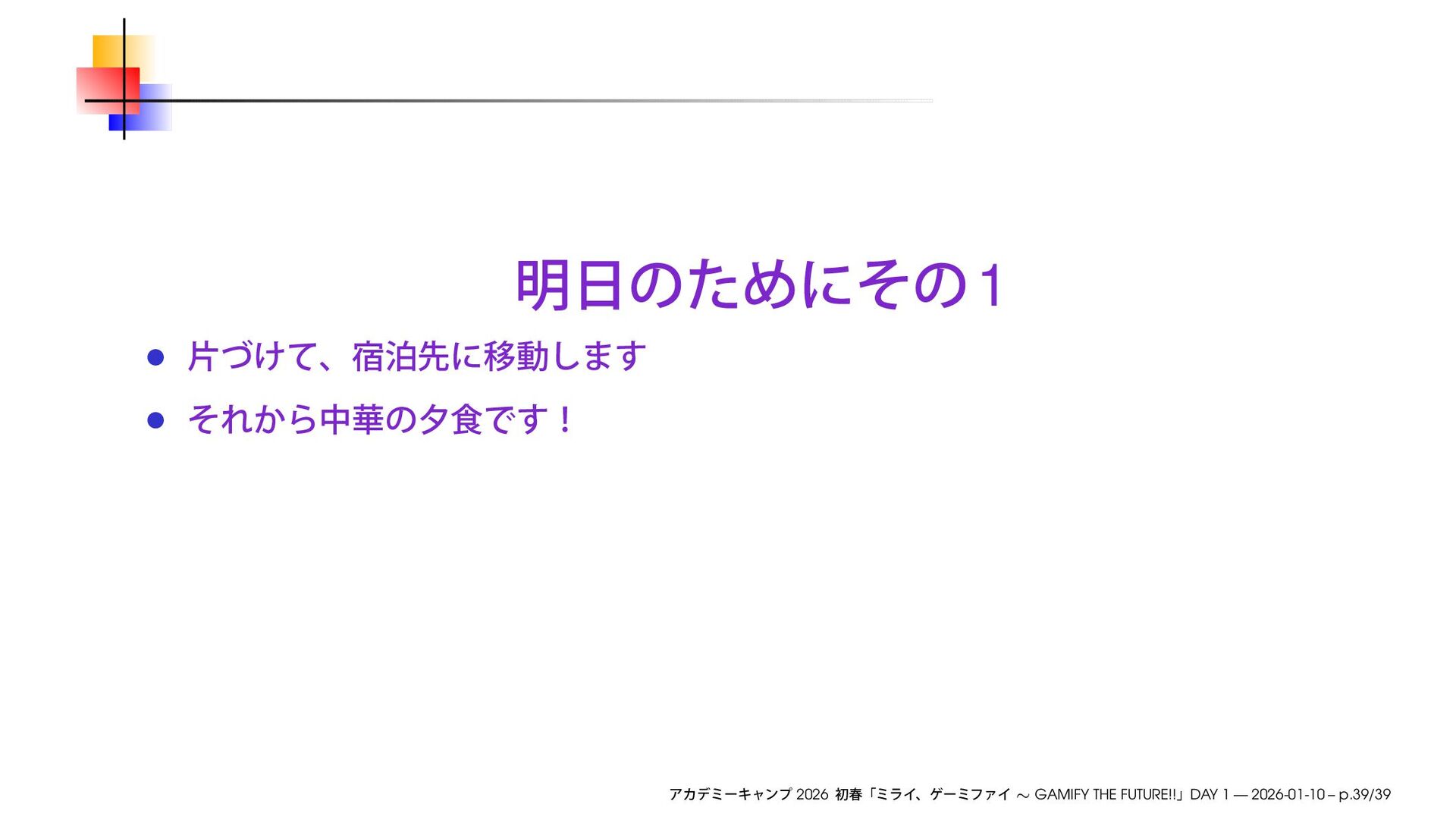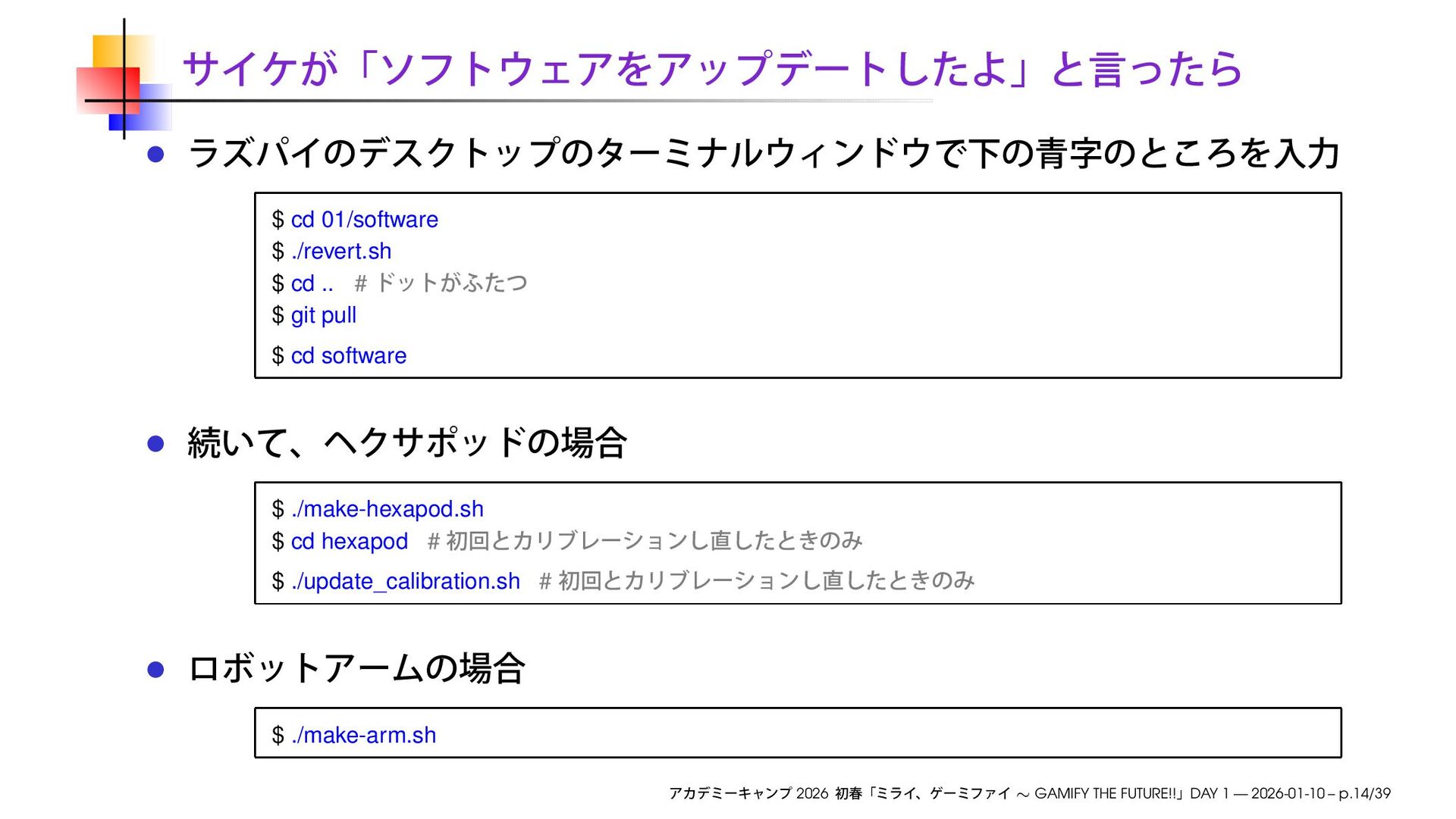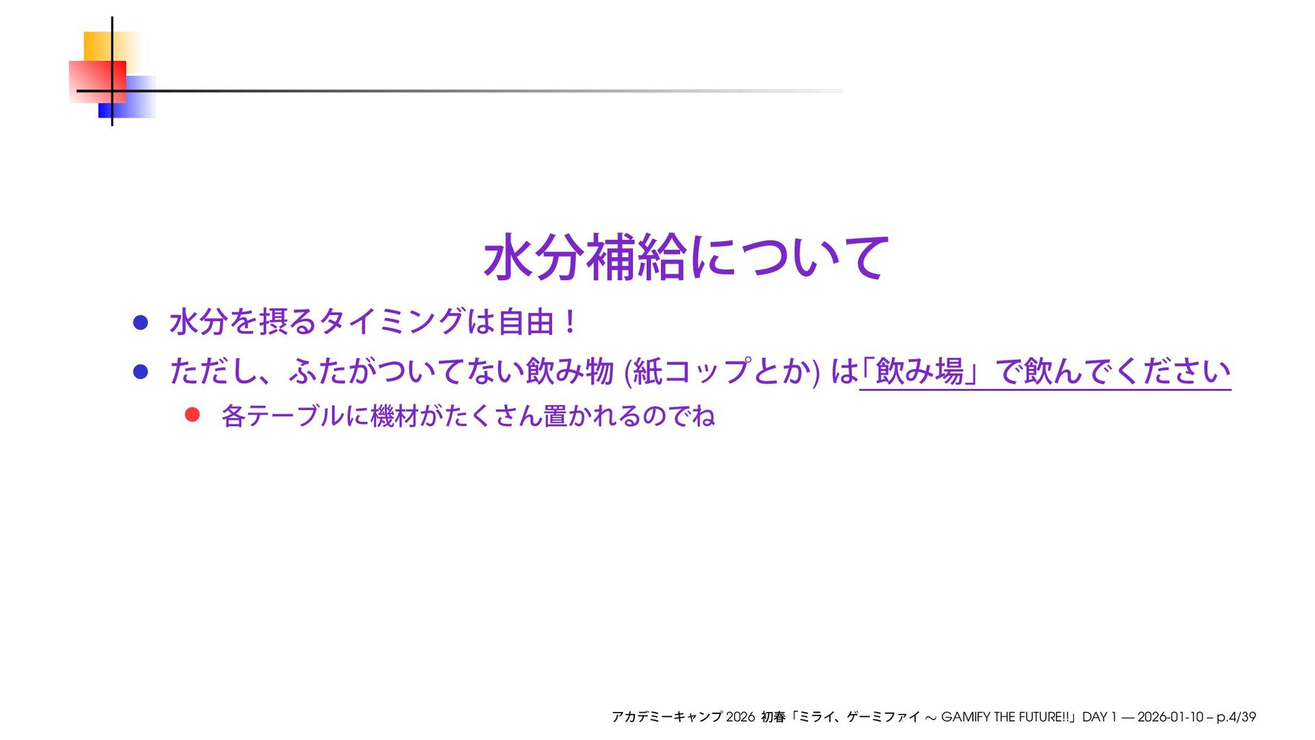 https://play.google.com/store/apps/details?id=com.interpreter.app&hl=ja 01 Light . . . “Continue ( )” “I have backed up all my files ( )” “I understand the safety implications of running AI generated code on my computer (AI )” “I have read and agreed to the 01 App terms of service (01 )” “Tap to scan ( )” 2026 ∼ GAMIFY THE FUTURE!! DAY 1 — 2026-01-10 – p.13/39
