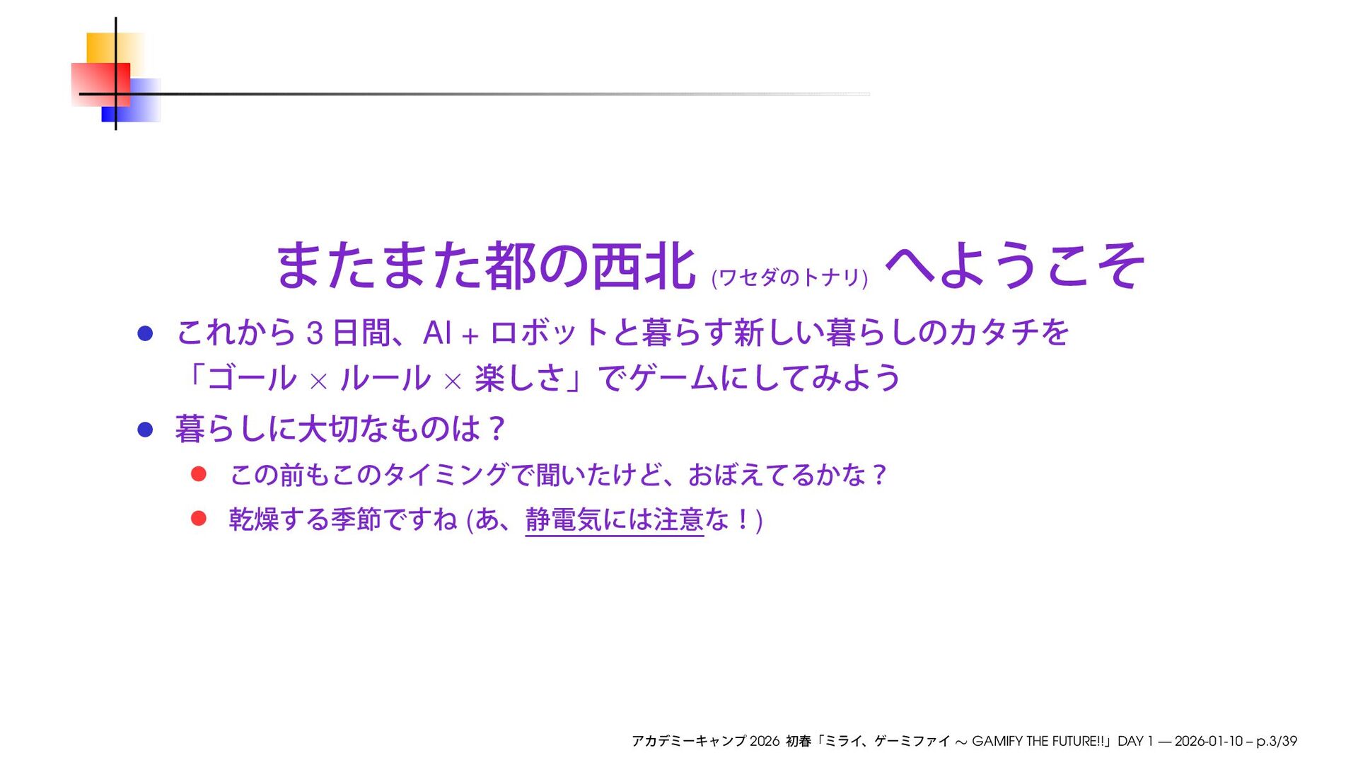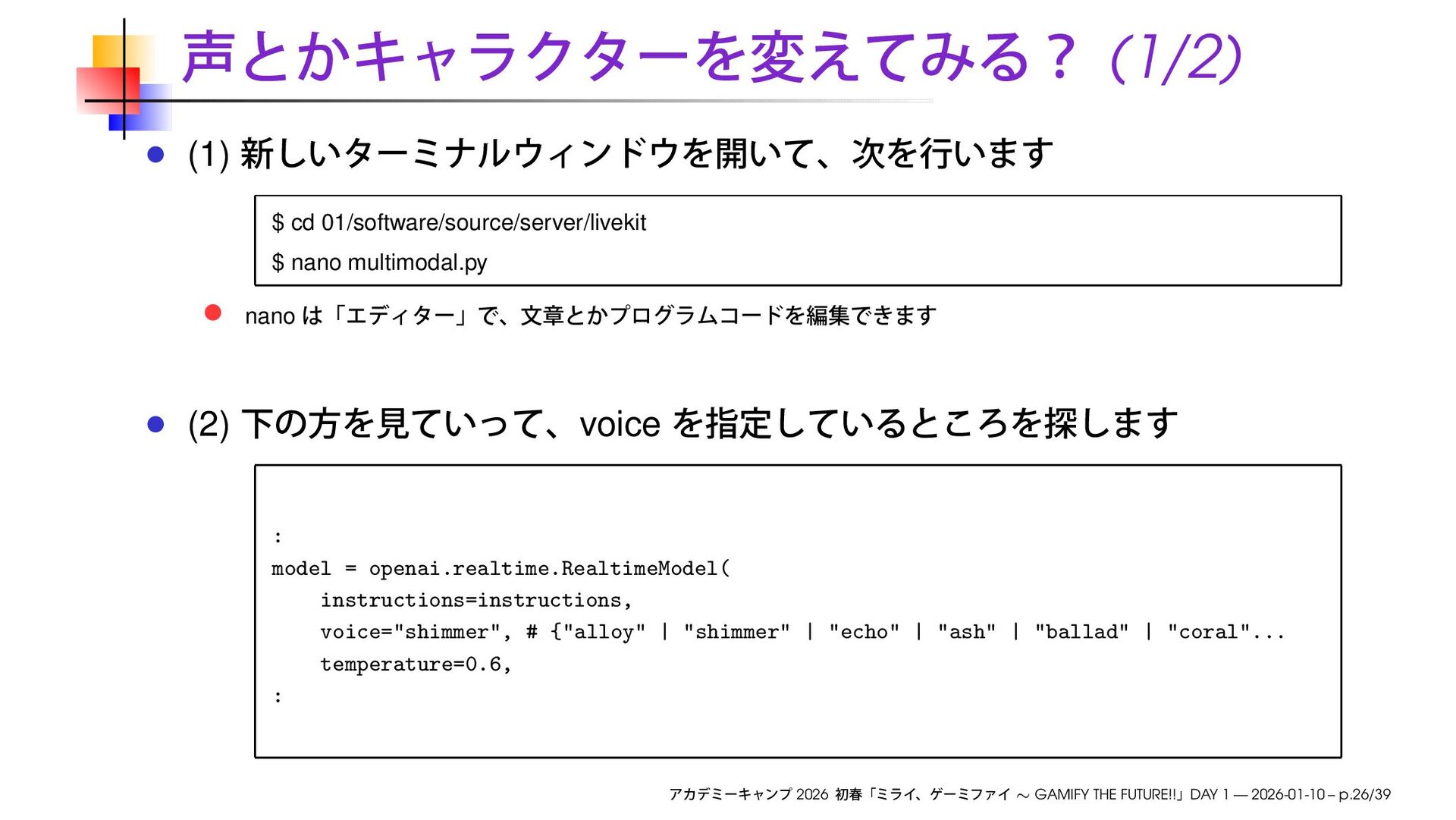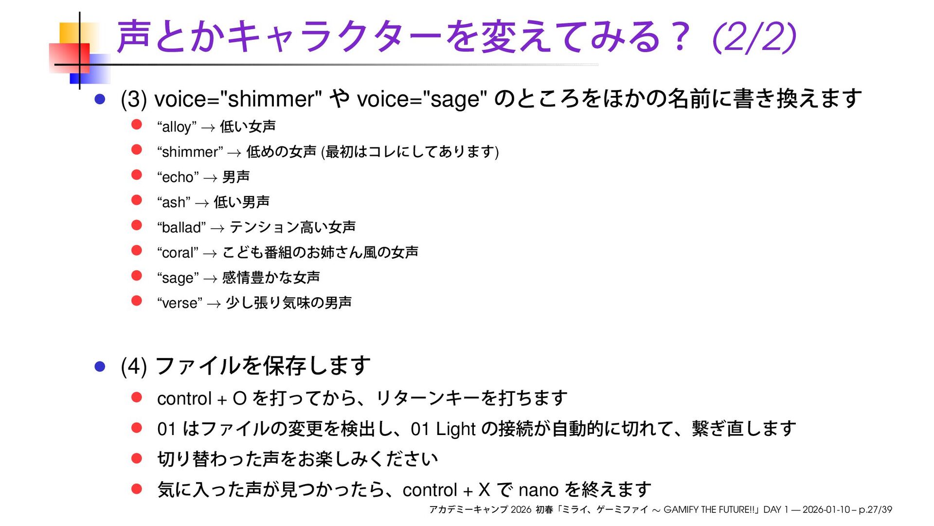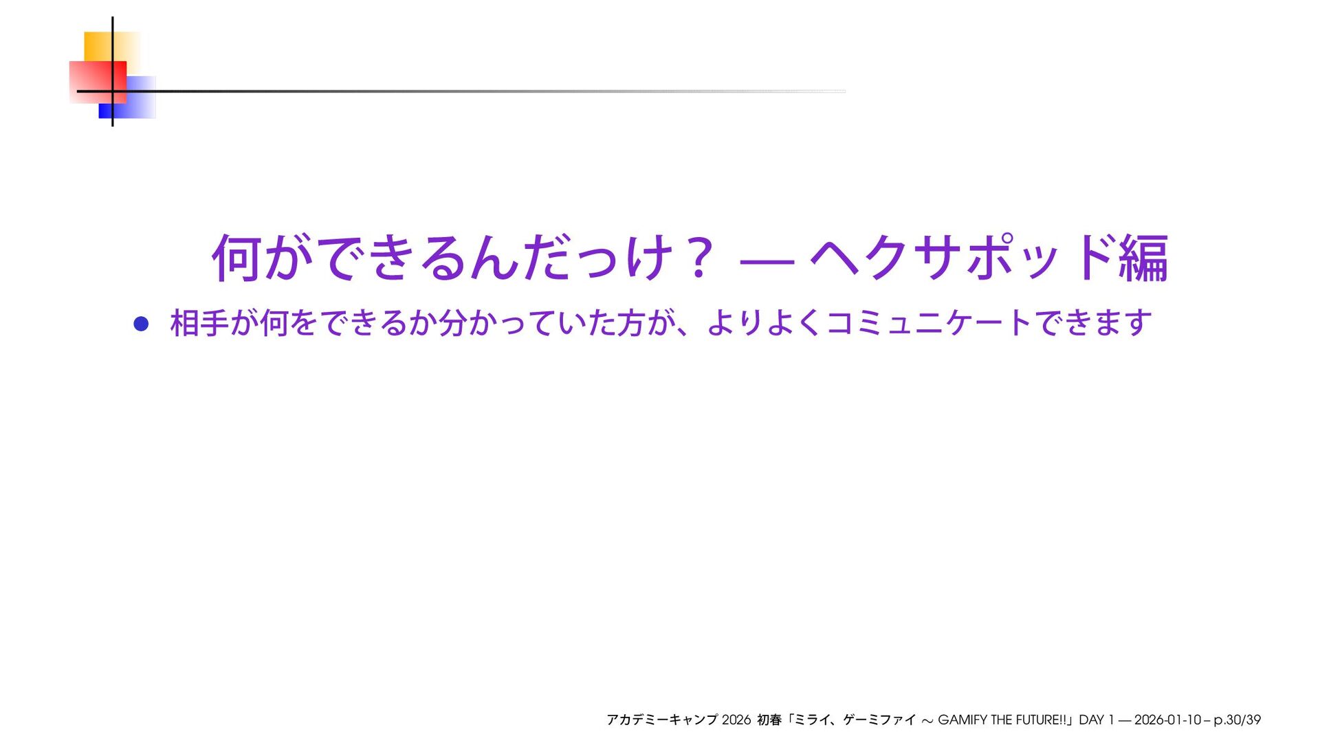 https://play.google.com/store/apps/details?id=com.interpreter.app&hl=ja 01 Light . . . “Continue ( )” “I have backed up all my files ( )” “I understand the safety implications of running AI generated code on my computer (AI )” “I have read and agreed to the 01 App terms of service (01 )” “Tap to scan ( )” 2026 ∼ GAMIFY THE FUTURE!! DAY 1 — 2026-01-10 – p.13/39