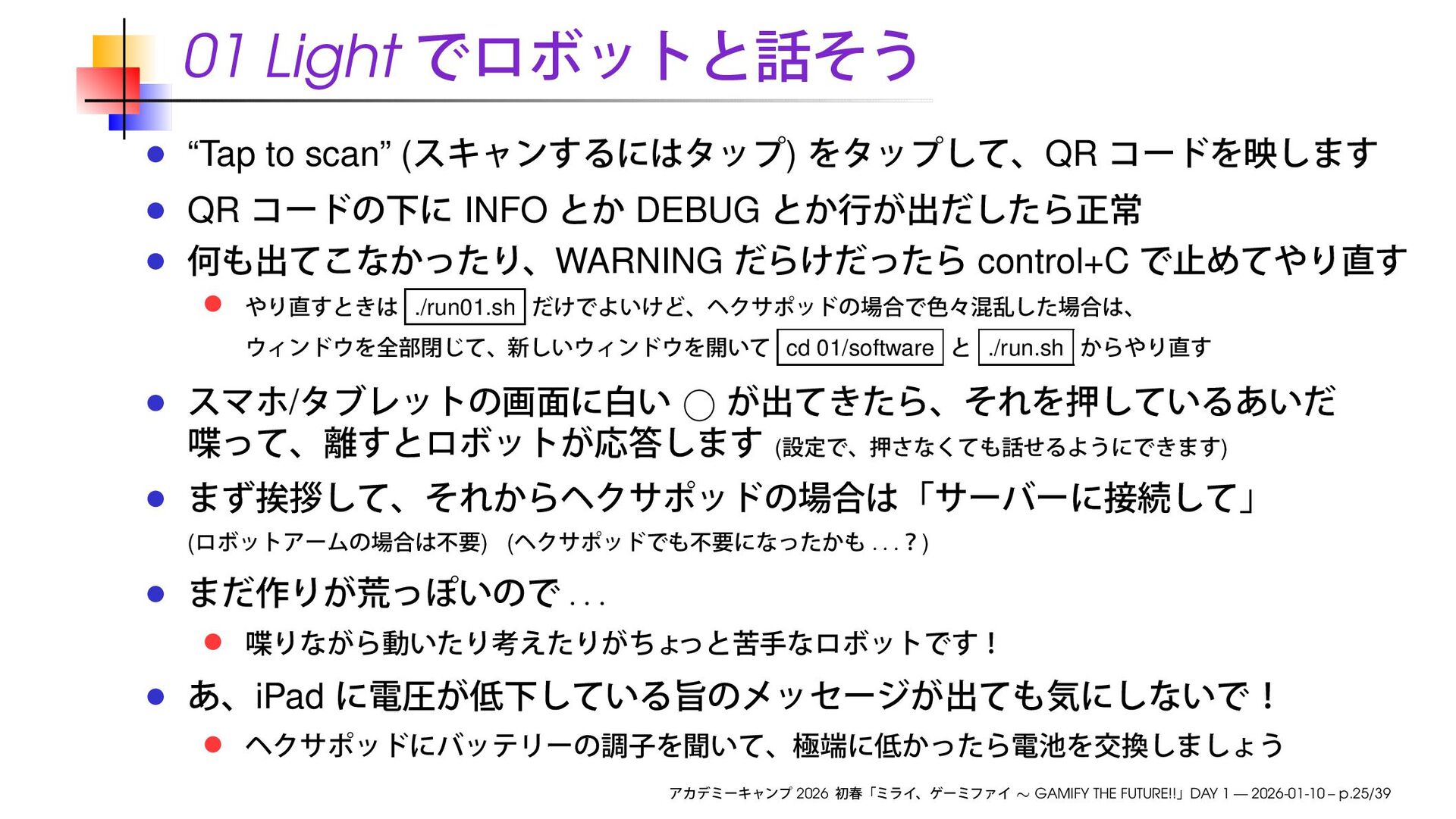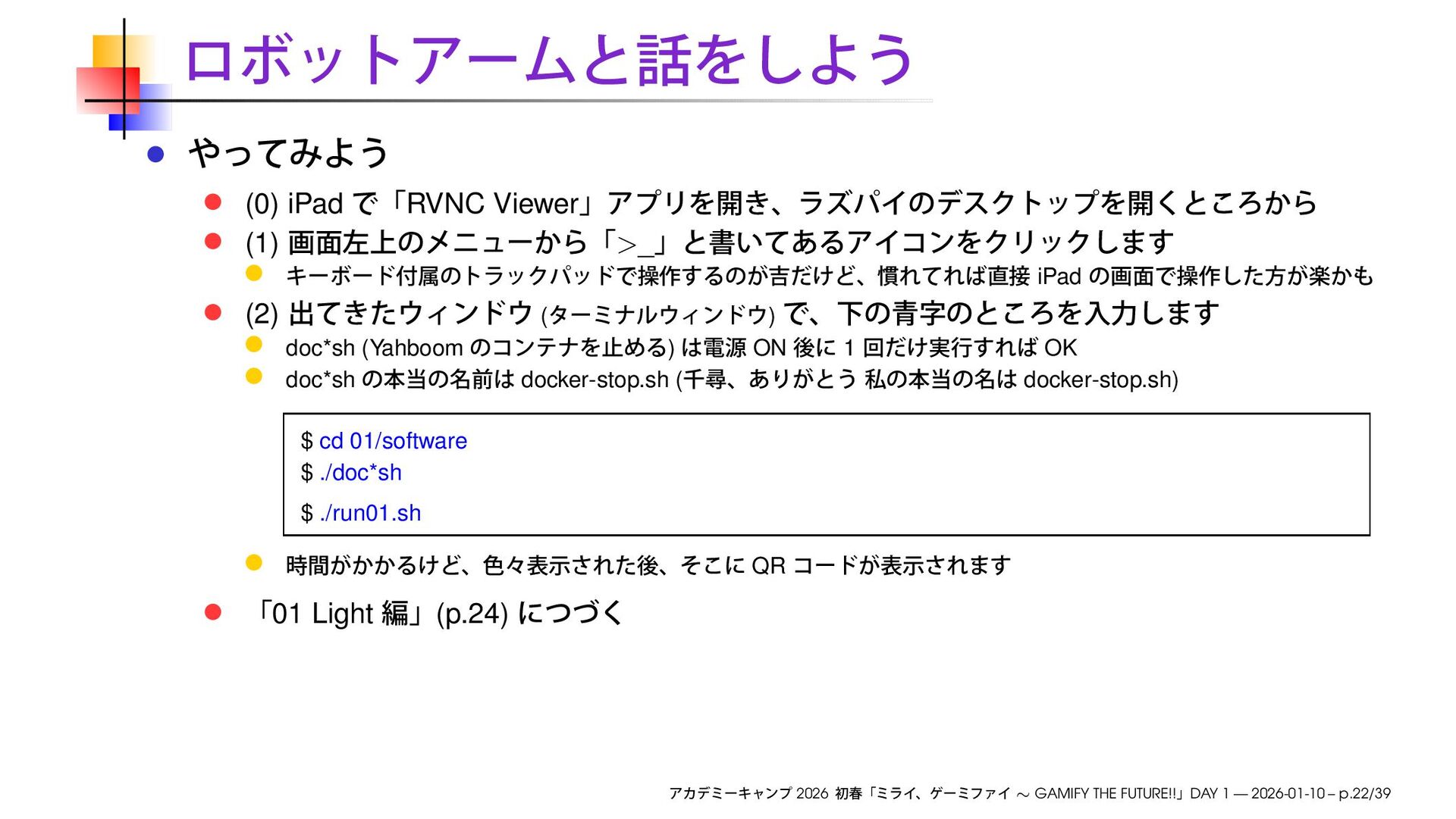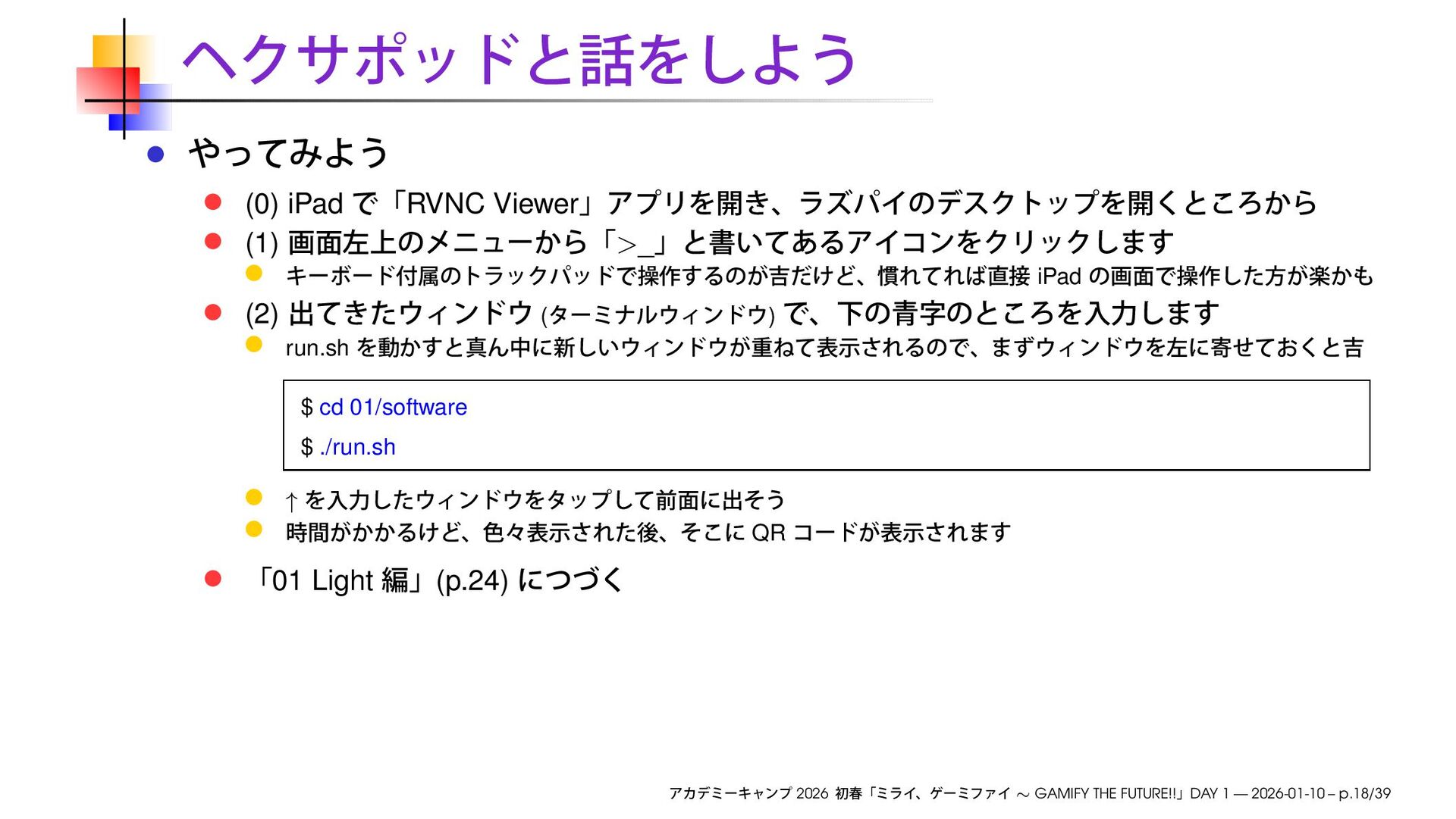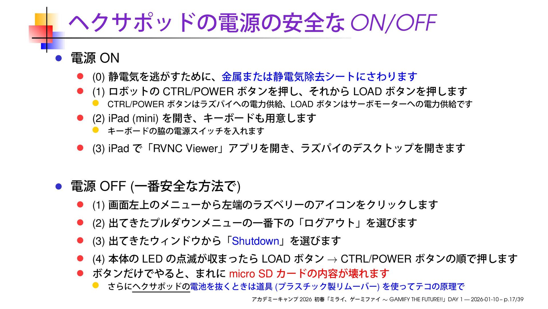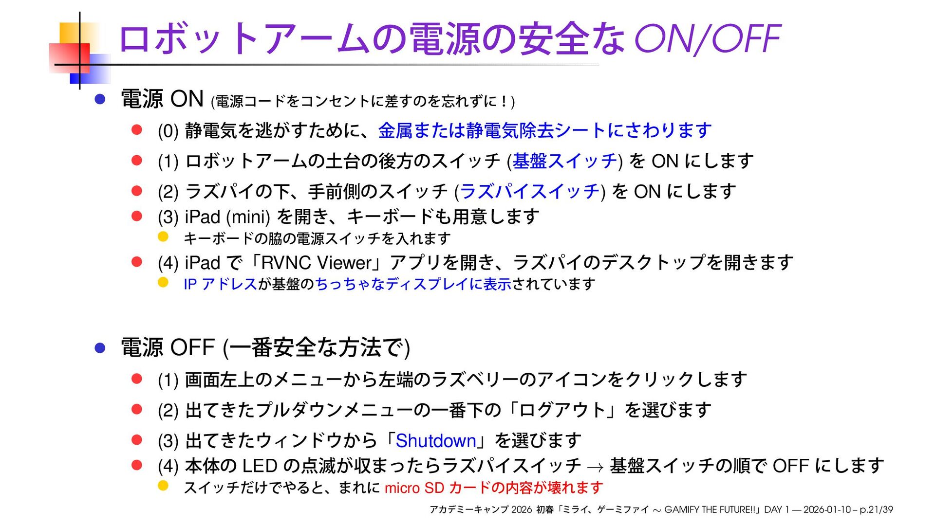 ( ) ON (3) iPad (mini) (4) iPad RVNC Viewer IP OFF ( ) (1) (2) (3) Shutdown (4) LED → OFF micro SD 2026 ∼ GAMIFY THE FUTURE!! DAY 1 — 2026-01-10 – p.21/39