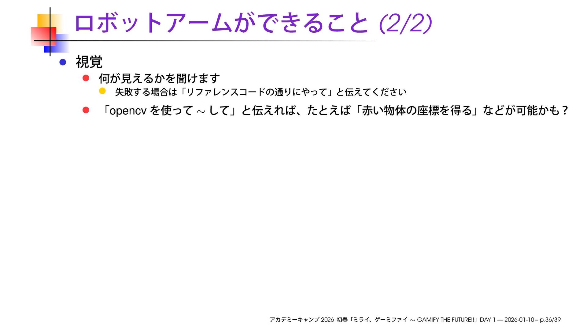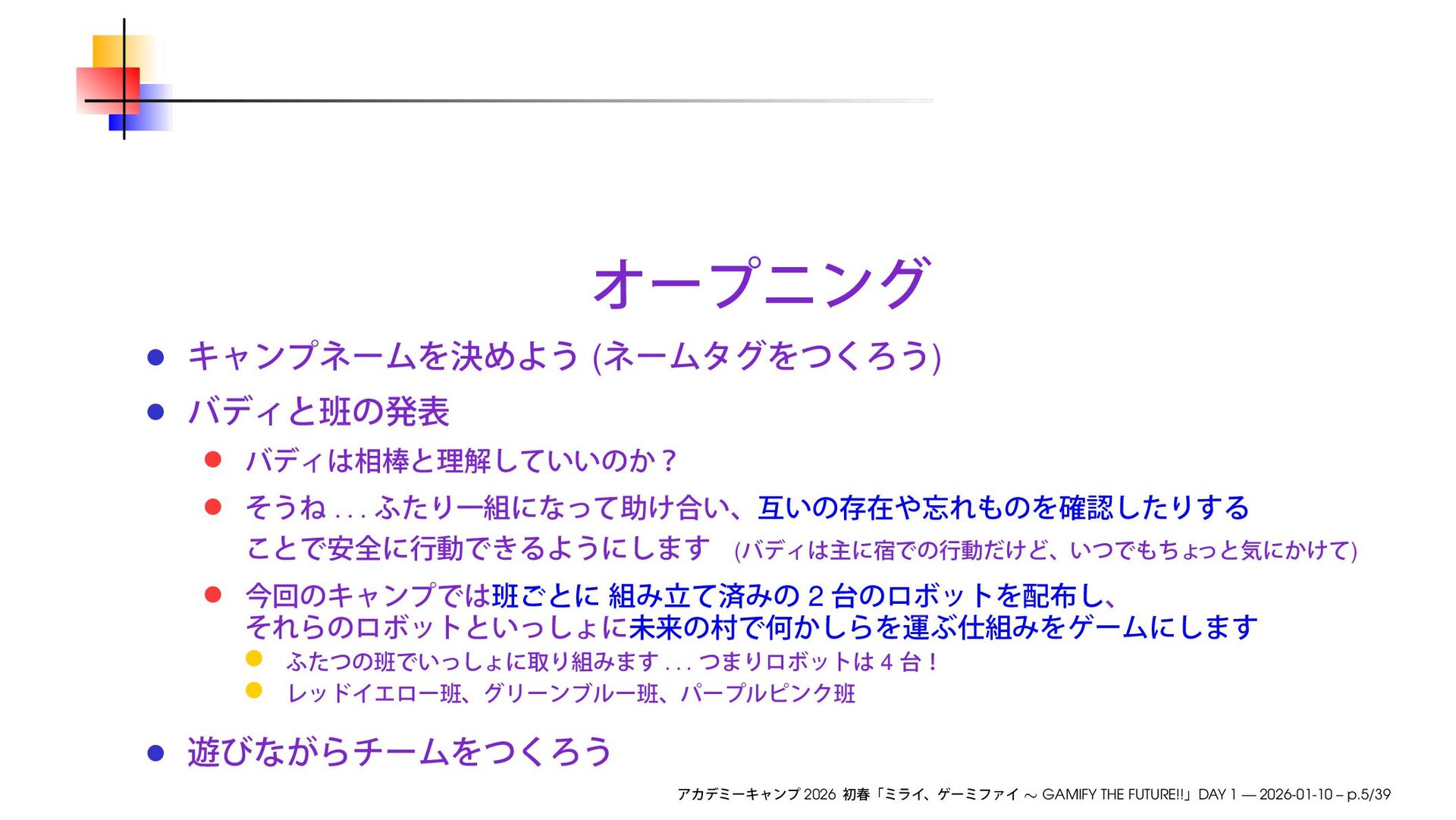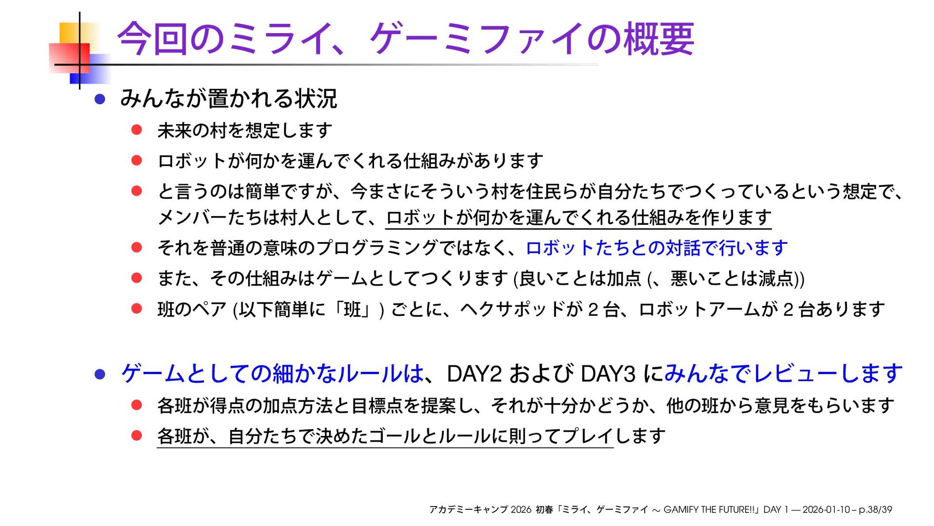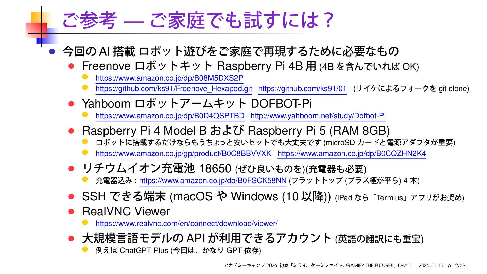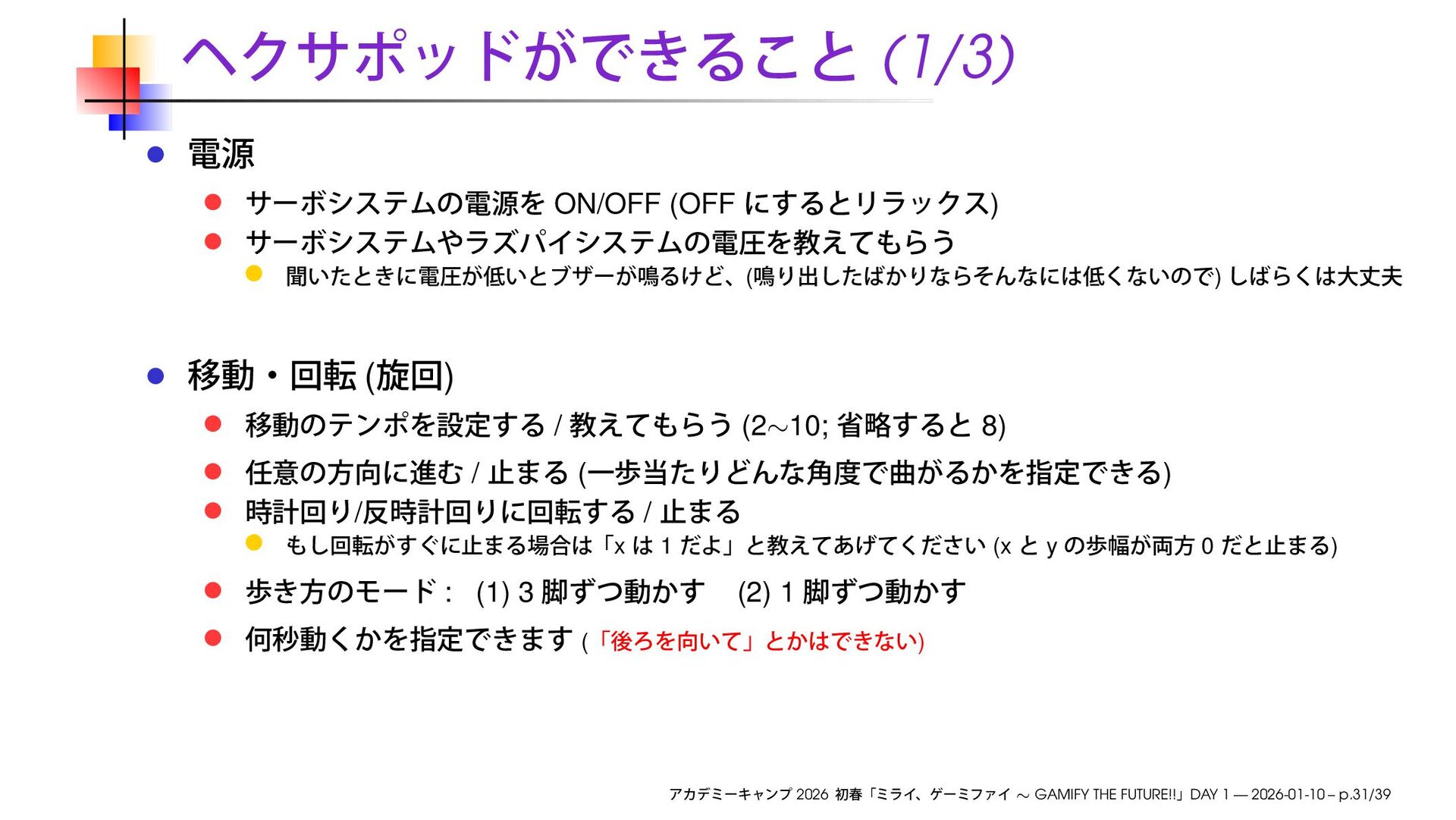 ( ) ON (3) iPad (mini) (4) iPad RVNC Viewer IP OFF ( ) (1) (2) (3) Shutdown (4) LED → OFF micro SD 2026 ∼ GAMIFY THE FUTURE!! DAY 1 — 2026-01-10 – p.21/39