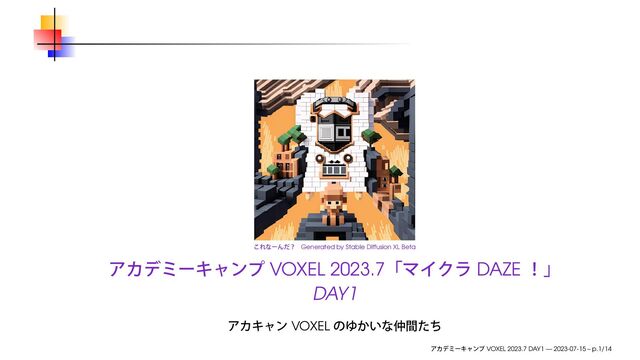 2023年7月15日(土) に開催したアカデミーキャンプ VOXEL 2023.7「マイクラDAZE !」DAY1 のスライドです。