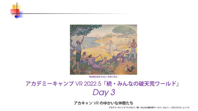 2022年5月5日に開催されたアカデミーキャンプ VR 2022.5「続・みんなの破天荒ワールド」Day 3 で用いたスライドです。